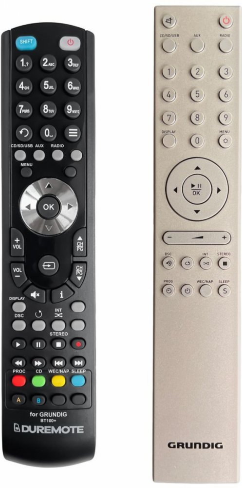 Dálkový ovladač GRUNDIG BT1000DAB+, BT2000DAB+, MS530DAB+, MS540DAB+ duplikát 1:1 originálního dálkového ovladače. Dokonalá 1:1 kopie navržená a vyrobená naší firmou – má všechny funkce originálního ovladače pro tyto modely značky GRUNDIG:BT 1000 DAB+, BT 2000 DAB+, BT1000DAB+, MS510, MS520, MS530DAB+, MS540DAB+. (Nemusí zde být uvedeny úplně všechny kompatibilní modely. Pokud si nejste jisti, sdělte nám svůj model (použijte online chat, e-mail, telefon), neprodleně zkontrolujeme a ověříme, zda je tento ovladač kompatibilní s Vaším přístrojem. Za poskytnutou informaci ručíme.) Dálkový ovladač General Duremote má naprosto všechny funkce a popisky tlačítek stejné jako originální dálkový ovladač. Není třeba nic nastavovat, žádné kódy, funguje ihned po vložení baterií se všemi výše uvedenými modely.Ovladač je dodáván ve verzi značkového dálkového ovladače General Duremote (zobrazen vlevo)Jedná se o ovladač vyrobený pro specifické zařízení – NENÍ to univerzální ovladač!Má naprosto všechny funkce jako originální dálkový ovladač.Má stejné popisky tlačítek, jako jste byli zvyklí z originálu.Popisky tlačítek jsou velmi odolné a nejdou seškrábat ani hrubou silou.3 roky záruka.Nulová poruchovost tohoto modelu! Nemáme zádné reklamace a přitom je to náš nejprodávanější ovladač.General Duremote byl tlačítko po tlačítku navržen a vyroben přesně podle originálního dálkového ovladače na obrázku vpravo. Výroben v naší firmě v Ostravě, vývoj, výroba i atesty v České republice - splňuje CE a ROHS standardy.SNADNÉ INTUITIVNÍ POUŽÍVÁNÍ: Na rozdíl od běžných náhradních ovladačů, General Duremote má 100% stejné popisky tlačítek jako Váš původní originální dálkový ovladač.Srovnání: Ostatní univerzální nebo programovatelné náhrady mají (kvůli úspoře nákladů) univerzální rozložení s nesprávně označenými tlačítky, a proto potřebují návod (tabulku funkcí), který říká, jaká je skutečná funkce jednotlivých tlačítek. To může způsobovat zmatek a nutnost neustálého vracení se k návodu je pro koncového uživatele obtěž..