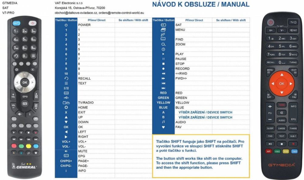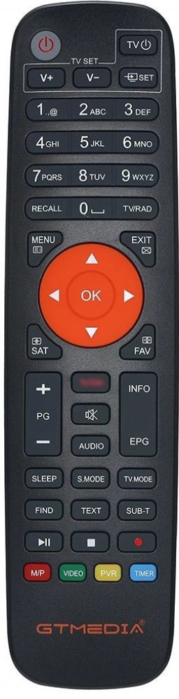 Náhradní dálkový ovladač GTMEDIA V7 PRO - 100% náhrada 1:1 za originální dálkový ovladač. Dálkový ovladač byl vyvinut speciálně na míru pro tyto modely značky GTMEDIA:V7 PRO, V7 PRO DVBS, V7 PRO S2, V7 PRO S2X, V7 PRO T, V7 PRO T2. (Nemusí zde být uvedeny úplně všechny kompatibilní modely. Pokud si nejste jisti, sdělte nám svůj model (použijte online chat, e-mail, telefon), neprodleně zkontrolujeme a ověříme, zda je tento ovladač kompatibilní s Vaším přístrojem. Za poskytnutou informaci ručíme.) Ovladač je dodáván ve verzi značkového dálkového ovladače General SAT/TV (zobrazen vlevo). Garantujeme Vám, že dostanete ovladač, který plně nahradí Váš původní originální ovladač a bude mít naprosto všechny funkce stejné.Není to univerzální ovladač, ale ovladač, který je naprogramován a přímo určen pro modely přístrojů uvedené výše. Není třeba žádné párování, žádné kódy. Obdržíte od nás ovladač, který je připraven k použití - jediné, co musíte udělat, je vložit baterie a ovladač hned funguje. Podívejte se na obrázek ovladače a ujistěte se, že jsou v tabulce všechny funkce jako na původním originálním ovladači. Jedná se o plnohodnotný náhradní dálkový ovladač (není to „univerzál“). Má naprosto všechny funkce přesně jako originální ovladač. Záruční lhůta na ovladač je 3 roky. Dodáván také jednoduchý návod s mapováním funkcí. DOPLŇKOVÁ FUNKCE: Tento dálkový ovladač je možno naprogramovat na 1 další přístroj. Budete moci jedním ovladačem ovládat oba přístroje (např. SAT+TV nebo SAT+DVD apod). Pokud nám do komentáře v objednávce napíšete model dalšího přístroje, naprogramujeme Vám ovladač na oba. Za tuto doplňkovou službu bude naúčtován příplatek k ceně ovladače 50 Kč: více informací