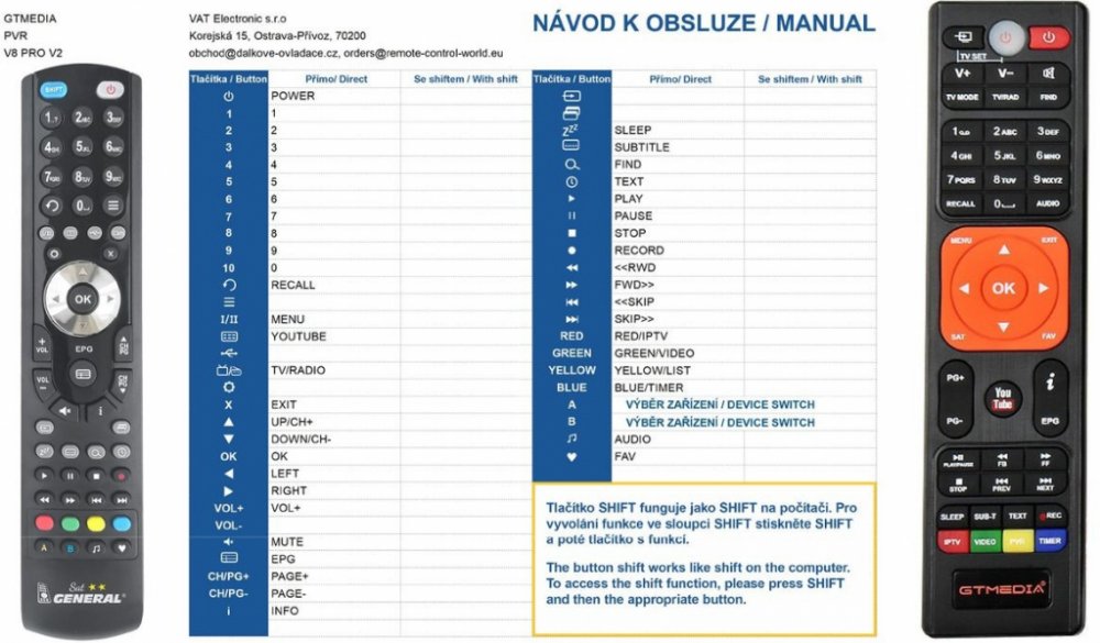Náhradní dálkový ovladač GTMEDIA V8PRO - 100% náhrada 1:1 za originální dálkový ovladač. Dokonalá 1:1 kopie navržená a vyrobená naší firmou – má všechny funkce originálního ovladače pro tyto modely značky GTMEDIA:V8 PRO , V8 PRO V2, V8 UHD. (Nemusí zde být uvedeny úplně všechny kompatibilní modely. Pokud si nejste jisti, sdělte nám svůj model (použijte online chat, e-mail, telefon), neprodleně zkontrolujeme a ověříme, zda je tento ovladač kompatibilní s Vaším přístrojem. Za poskytnutou informaci ručíme.) Ovladač je dodáván ve verzi značkového dálkového ovladače General Duremote (zobrazen vlevo). Garantujeme Vám, že dostanete ovladač, který plně nahradí Váš původní originální ovladač a bude mít naprosto všechny funkce stejné.Není to univerzální ovladač, ale ovladač, který je naprogramován a přímo určen pro modely přístrojů uvedené výše. Není třeba žádné párování, žádné kódy. Obdržíte od nás ovladač, který je připraven k použití - jediné, co musíte udělat, je vložit baterie a ovladač hned funguje. Podívejte se na obrázek ovladače a ujistěte se, že jsou v tabulce všechny funkce jako na původním originálním ovladači. Jedná se o plnohodnotný náhradní dálkový ovladač (není to „univerzál“). Má naprosto všechny funkce přesně jako originální ovladač. Záruční lhůta na ovladač je 3 roky. Dodáván také jednoduchý návod s mapováním funkcí. DOPLŇKOVÁ FUNKCE: Tento dálkový ovladač je možno naprogramovat na 1 další přístroj. Budete moci jedním ovladačem ovládat oba přístroje. Pokud nám do komentáře v objednávce napíšete model dalšího přístroje, naprogramujeme Vám ovladač na oba. Za tuto doplňkovou službu bude naúčtován příplatek k ceně ovladače 50 Kč: více informací