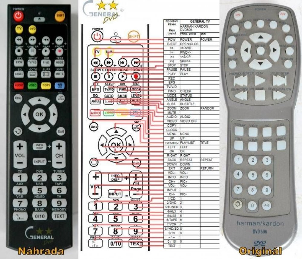 Náhradní dálkový ovladač HARMAN KARDON DVD-21, DVD-22, DVD-26, DVD-31, DVD-506 (DVD21, DVD22, DVD26, DVD31, DVD506) - 100% náhrada 1:1 za originální dálkový ovladač. Dokonalá 1:1 kopie navržená a vyrobená naší firmou – má všechny funkce originálního ovladače pro tyto modely značky HARMAN KARDON:DVD-21, DVD-22, DVD-26, DVD-31, DVD-506, DVD21, DVD22, DVD26, DVD31, DVD506. (Nemusí zde být uvedeny úplně všechny kompatibilní modely. Pokud si nejste jisti, sdělte nám svůj model (použijte online chat, e-mail, telefon), neprodleně zkontrolujeme a ověříme, zda je tento ovladač kompatibilní s Vaším přístrojem. Za poskytnutou informaci ručíme.) Ovladač je dodáván ve verzi značkového dálkového ovladače General DVD/AUDIO (zobrazen vlevo). Garantujeme Vám, že dostanete ovladač, který plně nahradí Váš původní originální ovladač a bude mít naprosto všechny funkce stejné.Není to univerzální ovladač, ale ovladač, který je naprogramován a přímo určen pro modely přístrojů uvedené výše. Není třeba žádné párování, žádné kódy. Obdržíte od nás ovladač, který je připraven k použití - jediné, co musíte udělat, je vložit baterie a ovladač hned funguje. Podívejte se na obrázek ovladače a ujistěte se, že jsou v tabulce všechny funkce jako na původním originálním ovladači. Jedná se o plnohodnotný náhradní dálkový ovladač (není to „univerzál“). Má naprosto všechny funkce přesně jako originální ovladač. Záruční lhůta na ovladač je 3 roky. Dodáván také jednoduchý návod s mapováním funkcí. DOPLŇKOVÁ FUNKCE: Tento dálkový ovladač je možno naprogramovat na 1 další přístroj. Budete moci jedním ovladačem ovládat oba přístroje (např. DVD+TV nebo SOUNDBAR+TV apod.). Pokud nám do komentáře v objednávce napíšete model dalšího přístroje, naprogramujeme Vám ovladač na oba. Za tuto doplňkovou službu bude naúčtován příplatek k ceně ovladače 50 Kč: více informací