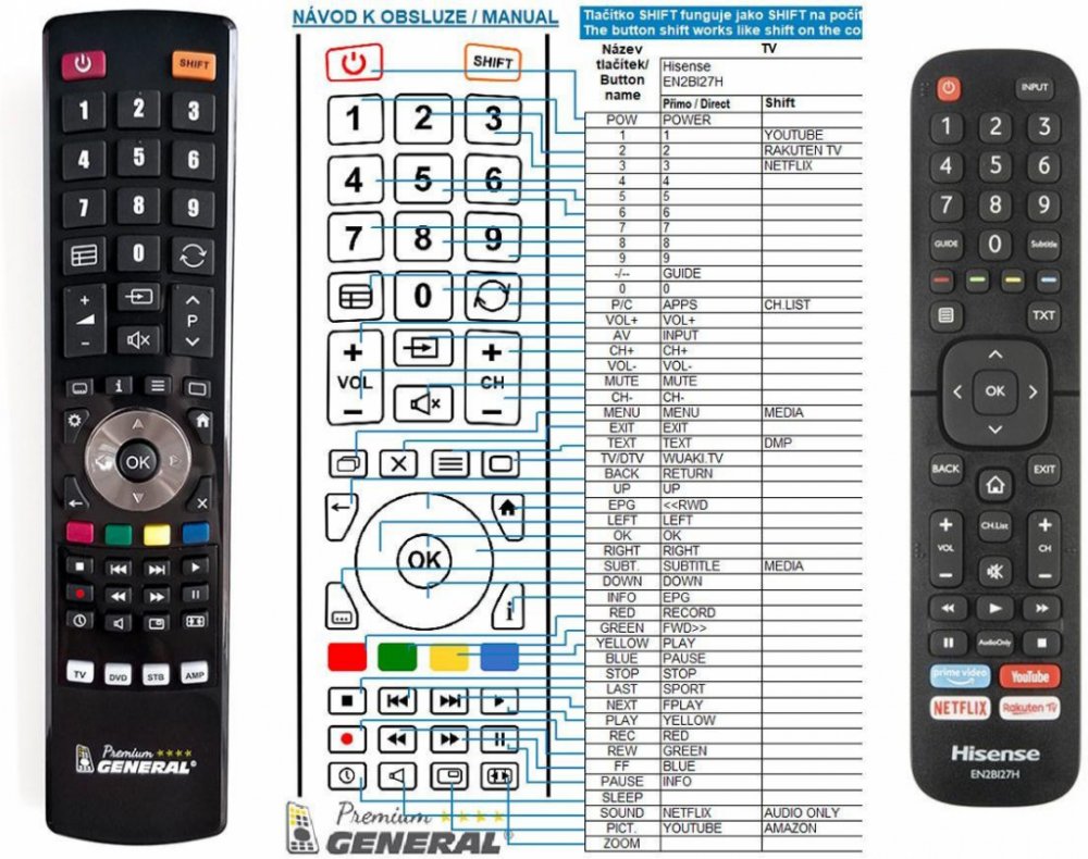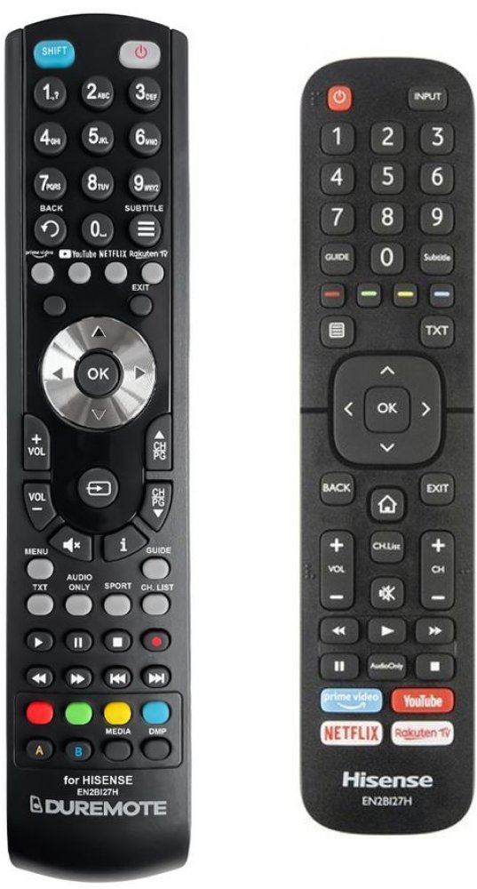 Dálkový ovladač HISENSE EN2BI27H duplikát 1:1 originálního dálkového ovladače. Dokonalá 1:1 kopie navržená a vyrobená naší firmou – má všechny funkce originálního ovladače pro tyto modely značky HISENSE:32A5600F, 32A5620F, 32AE5500F, 40A5600F, 40A5620F, 43A7100F, 43A7120F, 43AE7000F, 50A7100F, 50AE7000F, 55A7100F, 55AE7000F, 55AE700F, 58A7100F, 58AE7010F, 65A7100F, A20070E, H32A5800, H32B5600, H32B5620, H32BE5500, H40B5600, H43B7100, H43B7300, H43B7500, H43BE7000, H43BE7400, H50B7000, H50B7100, H50B7300, H50B7500, H50B7500UK, H50BE7000, H50BE7400, H55B7100, H55B7300, H55B7500, H55B7520, H55BE7000, H55BE7200, H65B7100, H65B7300, H65B7500, H65BE7200, H75B7510, H75BE7400. (Nemusí zde být uvedeny úplně všechny kompatibilní modely. Pokud si nejste jisti, sdělte nám svůj model (použijte online chat, e-mail, telefon), neprodleně zkontrolujeme a ověříme, zda je tento ovladač kompatibilní s Vaším přístrojem. Za poskytnutou informaci ručíme.) Dálkový ovladač General Duremote má naprosto všechny funkce a popisky tlačítek stejné jako originální dálkový ovladač. Není třeba nic nastavovat, žádné kódy, funguje ihned po vložení baterií se všemi výše uvedenými modely.Ovladač je dodáván ve verzi značkového dálkového ovladače General Duremote (zobrazen vlevo)Jedná se o ovladač vyrobený pro specifické zařízení – NENÍ to univerzální ovladač!Má naprosto všechny funkce jako originální dálkový ovladač.Má stejné popisky tlačítek, jako jste byli zvyklí z originálu.Popisky tlačítek jsou velmi odolné a nejdou seškrábat ani hrubou silou.3 roky záruka.Nulová poruchovost tohoto modelu! Nemáme zádné reklamace a přitom je to náš nejprodávanější ovladač.General Duremote byl tlačítko po tlačítku navržen a vyroben přesně podle originálního dálkového ovladače na obrázku vpravo. Výroben v naší firmě v Ostravě, vývoj, výroba i atesty v České republice - splňuje CE a ROHS standardy.SNADNÉ INTUITIVNÍ POUŽÍVÁNÍ: Na rozdíl od běžných náhradních ovladačů, General Duremote má 100% stejné popisky tlačítek jako Váš původní originální d..