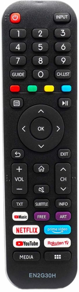 Náhradní dálkový ovladač HISENSE EN2G30H. Je určen pro tyto modely HISENSE: 55A7100F, 65A7100F, 43A519EEVS, 43A7100F, 43A7300F, 43A7500F, 43AE7000F, 43AE700F, 43AE7010F, 43AE7200F, 50A7100F, 50A7120F, 50A7300F, 50A7500F, 50AE7000F, 50AE7010F, 55A6803FUWTS, 55A7100F, 55A7300F, 55A7500F, 55A85H, 58A7100F, 58A7120F, 58AE7000F, 65A6803FUWTS, 65A7300F, 65AE7000F, 70A7100F, 75A7100F, A20250K, A20250L, A7300F, HE43A6103FUWTS, HE43A6507EUWTS, HE50A6103FUWTS, HE50A6109FUWTS, HE50A6803FUWTS, HE55A6103FUWTS, HE55A6109FUWTS, HE58A6100FUWTS, HE58A6100FUWTS0100, HE65A6103FUWTS, HE65A6109FUWTS, HE70A6109FUWTS, HE75A6170FUWTS. (Nemusí zde být uvedeny úplně všechny kompatibilní modely. Pokud si nejste jisti, sdělte nám svůj model (použijte online chat, e-mail, telefon), neprodleně zkontrolujeme a ověříme, zda je tento ovladač kompatibilní s Vaším přístrojem. Za poskytnutou informaci ručíme.) Jedná se o naprosto stejný dálkový ovladač jako originál. Jediný rozdíl je, že nemá logo HISENSE (to je jediný důvod, proč je levnější). Vysoká kvalita materiálu a zpracování, naprosto bezporuchový. Všechny naše dálkové ovladače kontrolujeme a testujeme, proto garantujeme jejich spolehlivost, nadstandartně dlouhý dosah signálu a výbornou citlivost tlačítek.Tento dálkový ovladač nemusíte nijak párovat, nevyžaduje žádné nastavování ani kódy. Stačí vložit baterie a funguje se všemi výše uvedenými modely.