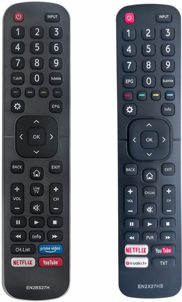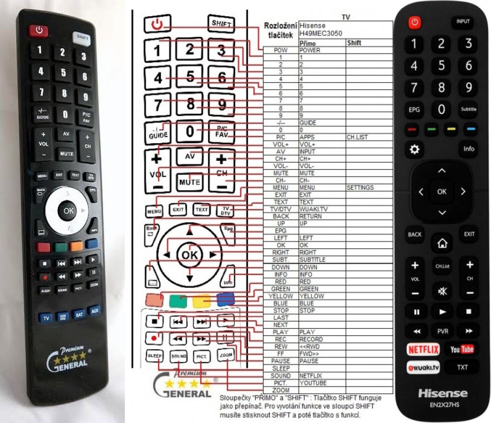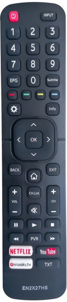 Náhradní dálkový ovladač HISENSE EN2X27HS - 100% náhrada 1:1 za originální dálkový ovladač. Dálkový ovladač je určen pro tyto modely HISENSE:32N2170HW, 39N2170PW, 40A5700FA, 40N2170PW, 43N2170PW, 49N2170PW, H32M2600, H40M2600, H40M3300, H43M3000, H43MEC3050, H43N5300, H43N5700, H49M2600, H49M3000, H49MEC2650, H49MEC3050, H49N5300, H50M3300, H50M5500, H50N5300, H50N5300UK, H55A6140, H55AE6000, H55EA6000, H55M3300, H55M5500, H55M7000, H55MEC3050, H55N5300, H55NEC5200, H65M5500, H65MEC5550, H65N5300, H75M7900, HE40K3300, HE43K300UWTS, HE49K3000UWTS, HE50K3300, HE50K3300UWTS, HE55K3300, HE65K5500UWTS, LEDD50K300P, M50M3300. (Nemusí zde být uvedeny úplně všechny kompatibilní modely. Pokud si nejste jisti, sdělte nám svůj model (použijte online chat, e-mail, telefon), neprodleně zkontrolujeme a ověříme, zda je tento ovladač kompatibilní s Vaším přístrojem. Za poskytnutou informaci ručíme.) Ovladač je dodáván ve verzi značkového dálkového ovladače General Premium (zobrazen vlevo). Garantujeme Vám, že dostanete ovladač, který plně nahradí Váš původní originální ovladač a bude mít naprosto všechny funkce stejné.Není to univerzální ovladač, ale ovladač, který je naprogramován a přímo určen pro modely přístrojů uvedené výše. Není třeba žádné párování, žádné kódy. Obdržíte od nás ovladač, který je připraven k použití - jediné, co musíte udělat, je vložit baterie a ovladač hned funguje. Podívejte se na obrázek ovladače a ujistěte se, že jsou v tabulce všechny funkce jako na původním originálním ovladači. Jedná se o plnohodnotný náhradní dálkový ovladač (není to „univerzál“). Má naprosto všechny funkce přesně jako originální ovladač. Záruční lhůta na ovladač je 3 roky. Dodáván také jednoduchý návod s mapováním funkcí. DOPLŇKOVÁ FUNKCE: Tento dálkový ovladač je možno naprogramovat na 1-4 zařízení (celkem tedy 4). Budete moci jedním ovladačem ovládat několik různých přístrojů jedním ovladačem. Pokud nám do komentáře v objednávce napíšete modely dalších přístrojů, naprogram..