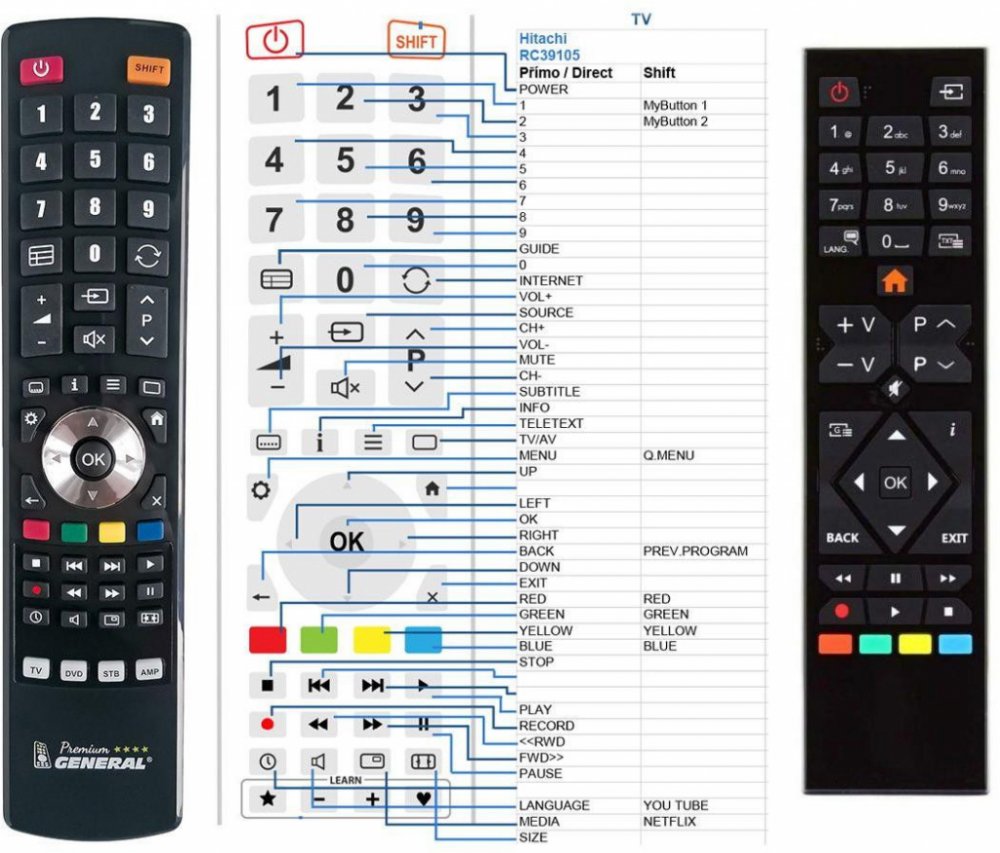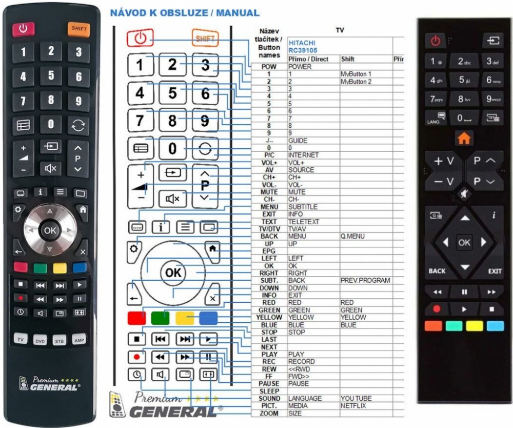 Náhradní dálkový ovladač HITACHI RC39105 - 100% náhrada 1:1 za originální dálkový ovladač. Dálkový ovladač je určen pro tyto modely HITACHI:24HE1000. (Nemusí zde být uvedeny úplně všechny kompatibilní modely. Pokud si nejste jisti, sdělte nám svůj model (použijte online chat, e-mail, telefon), neprodleně zkontrolujeme a ověříme, zda je tento ovladač kompatibilní s Vaším přístrojem. Za poskytnutou informaci ručíme.) Ovladač je dodáván ve verzi značkového dálkového ovladače General Premium (zobrazen vlevo). Garantujeme Vám, že dostanete ovladač, který plně nahradí Váš původní originální ovladač a bude mít naprosto všechny funkce stejné.Není to univerzální ovladač, ale ovladač, který je naprogramován a přímo určen pro modely přístrojů uvedené výše. Není třeba žádné párování, žádné kódy. Obdržíte od nás ovladač, který je připraven k použití - jediné, co musíte udělat, je vložit baterie a ovladač hned funguje. Podívejte se na obrázek ovladače a ujistěte se, že jsou v tabulce všechny funkce jako na původním originálním ovladači. Jedná se o plnohodnotný náhradní dálkový ovladač (není to „univerzál“). Má naprosto všechny funkce přesně jako originální ovladač. Záruční lhůta na ovladač je 3 roky. Dodáván také jednoduchý návod s mapováním funkcí. DOPLŇKOVÁ FUNKCE: Tento dálkový ovladač je možno naprogramovat na 1-4 zařízení (celkem tedy 4). Budete moci jedním ovladačem ovládat několik různých přístrojů jedním ovladačem. Pokud nám do komentáře v objednávce napíšete modely dalších přístrojů, naprogramujeme Vám ovladač na všechny. Za tuto doplňkovou službu bude naúčtován příplatek k ceně ovladače 50 Kč: více informacíV případě, že v budoucnu vyměníte/obměníte Vaši domácí elektroniku, jsme schopni Vám tento ovladač přeprogramovat na naprosto jakékoliv nové/á zařízení. Ovladač General přežije Váš stávající přístroj!
