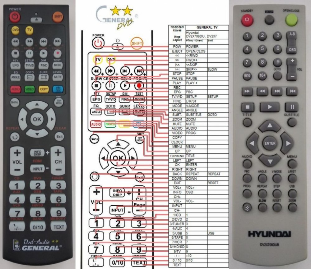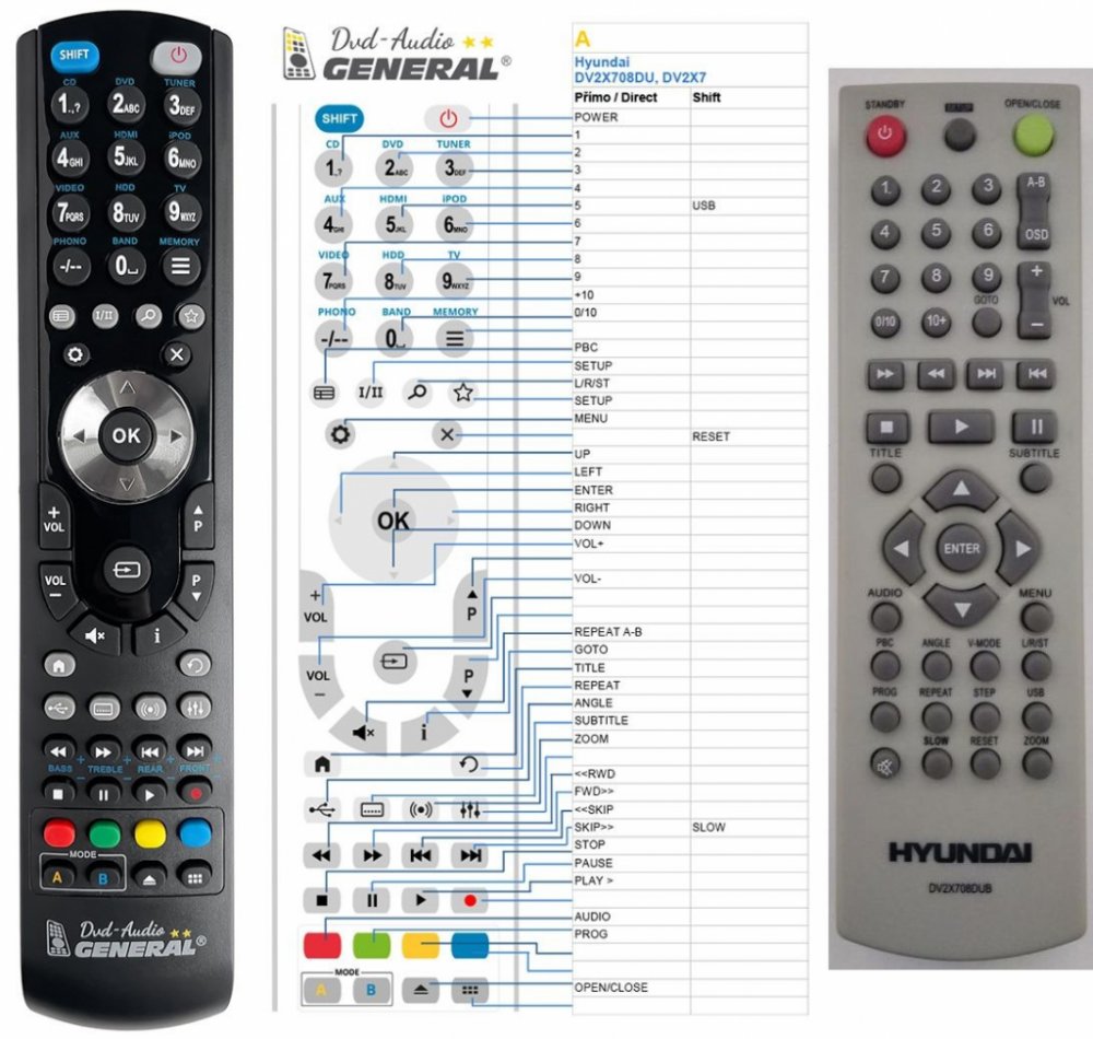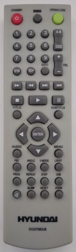 Náhradní dálkový ovladač HYUNDAI DV2X708DU - 100procent náhrada 1:1 za originální dálkový ovladač. Dálkový ovladač je určen pro tyto modely HYUNDAI: DV-2-X708DU, DV-2-X709DU, DV-2X-708DU, DV-2X707D, DV2X707D, DV2X708DU, DV2X708DUB, DV2X709DU, DV2X709DUB, DV5X710. (Nemusí zde být uvedeny úplně všechny kompatibilní modely. Pokud si nejste jisti, sdělte nám svůj model (použijte online chat, e-mail, telefon), neprodleně zkontrolujeme a ověříme, zda je tento ovladač kompatibilní s Vaším přístrojem. Za poskytnutou informaci ručíme.) Ovladač je dodáván ve verzi značkového dálkového ovladače General DVD/AUDIO (zobrazen vlevo). Garantujeme Vám, že dostanete ovladač, který plně nahradí Váš původní originální ovladač a bude mít naprosto všechny funkce. Není to univerzální ovladač, ale ovladač, který je naprogramován a přímo určen pro modely přístrojů uvedené výše. Není třeba žádné párování, žádné kódy. Obdržíte od nás ovladač, který je připraven k použití - jediné, co musíte udělat, je vložit baterie a ovladač hned funguje. Podívejte se na obrázek ovladače a ujistěte se, že jsou v tabulce všechny funkce jako na původním originálním ovladači. Jedná se o plnohodnotný náhradní dálkový ovladač (není to „univerzál“). Má naprosto všechny funkce přesně jako originální ovladač. Záruční lhůta na ovladač je 2 roky. Dodáván také jednoduchý návod s mapováním funkcí. DOPLŇKOVÁ FUNKCE: Tento dálkový ovladač je možno naprogramovat na 1 další přístroj. Budete moci jedním ovladačem ovládat oba přístroje (např. DVD plus TV nebo SOUNDBAR plus TV apod.). Pokud nám do komentáře v objednávce napíšete model dalšího přístroje, naprogramujeme Vám ovladač na oba. Za tuto doplňkovou službu bude naúčtován příplatek k ceně ovladače 50 Kč: více informací