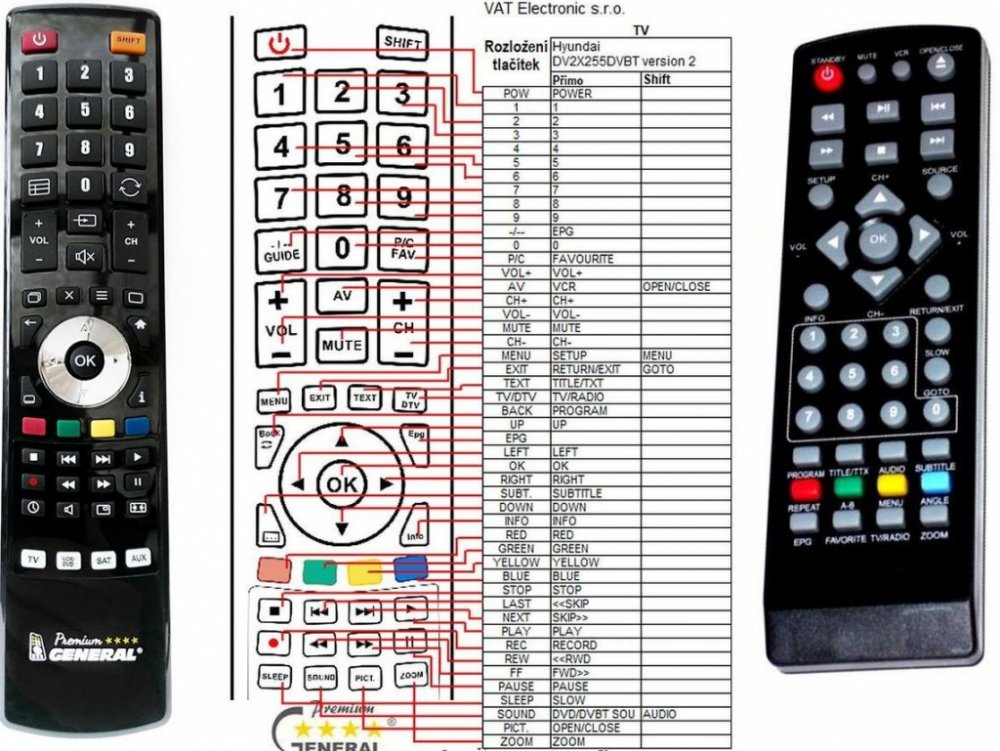Náhradní dálkový ovladač HYUNDAI DV2X255DVBT V2 - 100% náhrada 1:1 za originální dálkový ovladač. Dálkový ovladač byl vyvinut speciálně na míru pro tyto modely značky HYUNDAI:DV 2X236, DV-2-X-236, DV2X236, DV2X255DVBT. (Nemusí zde být uvedeny úplně všechny kompatibilní modely. Pokud si nejste jisti, sdělte nám svůj model (použijte online chat, e-mail, telefon), neprodleně zkontrolujeme a ověříme, zda je tento ovladač kompatibilní s Vaším přístrojem. Za poskytnutou informaci ručíme.) Pozor: Existuje 2. verze tohoto dálkového ovladače (klikněte na odkaz) DV2X255DVBT V1, která je nekompatibilní VYBÍREJTE PODLE TOHO, JAK VYPADAL VÁŠ PŮVODNÍ OVLADAČ.Ovladač je dodáván ve verzi značkového dálkového ovladače General Premium (zobrazen vlevo). Garantujeme Vám, že dostanete ovladač, který plně nahradí Váš původní originální ovladač a bude mít naprosto všechny funkce stejné.Není to univerzální ovladač, ale ovladač, který je naprogramován a přímo určen pro modely přístrojů uvedené výše. Není třeba žádné párování, žádné kódy. Obdržíte od nás ovladač, který je připraven k použití - jediné, co musíte udělat, je vložit baterie a ovladač hned funguje. Podívejte se na obrázek ovladače a ujistěte se, že jsou v tabulce všechny funkce jako na původním originálním ovladači. Jedná se o plnohodnotný náhradní dálkový ovladač (není to „univerzál“). Má naprosto všechny funkce přesně jako originální ovladač. Záruční lhůta na ovladač je 3 roky. Dodáván také jednoduchý návod s mapováním funkcí. DOPLŇKOVÁ FUNKCE: Tento dálkový ovladač je možno naprogramovat na 1-4 zařízení (celkem tedy 4). Budete moci jedním ovladačem ovládat několik různých přístrojů jedním ovladačem. Pokud nám do komentáře v objednávce napíšete modely dalších přístrojů, naprogramujeme Vám ovladač na všechny. Za tuto doplňkovou službu bude naúčtován příplatek k ceně ovladače 50 Kč: více informacíV případě, že v budoucnu vyměníte/obměníte Vaši domácí elektroniku, jsme schopni Vám tento ovladač přeprogramovat na ..