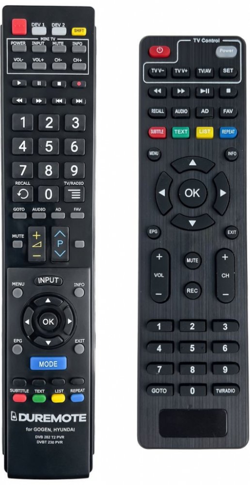Dálkový ovladač HYUNDAI DVBT230PVR duplikát 1:1 originálního dálkového ovladače. Dokonalá 1:1 kopie navržená a vyrobená naší firmou – má všechny funkce originálního ovladače pro tyto modely značky HYUNDAI:DVB T230 PVR. (Nemusí zde být uvedeny úplně všechny kompatibilní modely. Pokud si nejste jisti, sdělte nám svůj model (použijte online chat, e-mail, telefon), neprodleně zkontrolujeme a ověříme, zda je tento ovladač kompatibilní s Vaším přístrojem. Za poskytnutou informaci ručíme.) Dálkový ovladač General Duremote má naprosto všechny funkce a popisky tlačítek stejné jako originální dálkový ovladač. Není třeba nic nastavovat, žádné kódy, funguje ihned po vložení baterií se všemi výše uvedenými modely.Ovladač je dodáván ve verzi značkového dálkového ovladače General Duremote (zobrazen vlevo)DUPLIKÁT 2 v 1: Tento ovladač má sekci tlačítek MINI-TV pro funkce, které jej můžete naučit z Vašeho TV ovladače. To znamená, že jedním ovladačem můžete ovládat 2 přístroje, například set top box + základní funkce TV. Způsob učení tlačítek naleznete v přiloženém návodu v krabičce, ve které Vám bude ovladač dodán.Jedná se o ovladač vyrobený pro specifické zařízení – NENÍ to univerzální ovladač!Má naprosto všechny funkce jako originální dálkový ovladač.Má stejné popisky tlačítek, jako jste byli zvyklí z originálu.Popisky tlačítek jsou velmi odolné a nejdou seškrábat ani hrubou silou.3 roky záruka.Nulová poruchovost tohoto modelu! Nemáme zádné reklamace a přitom je to náš nejprodávanější ovladač.General Duremote byl tlačítko po tlačítku navržen a vyroben přesně podle originálního dálkového ovladače na obrázku vpravo. Výroben v naší firmě v Ostravě, vývoj, výroba i atesty v České republice - splňuje CE a ROHS standardy.SNADNÉ INTUITIVNÍ POUŽÍVÁNÍ: Na rozdíl od běžných náhradních ovladačů, General Duremote má 100% stejné popisky tlačítek jako Váš původní originální dálkový ovladač.Srovnání: Ostatní univerzální nebo programovatelné náhrady mají (kvůli úspoře nákladů) univerzální rozložení s nesprávně označenými tlačít..
