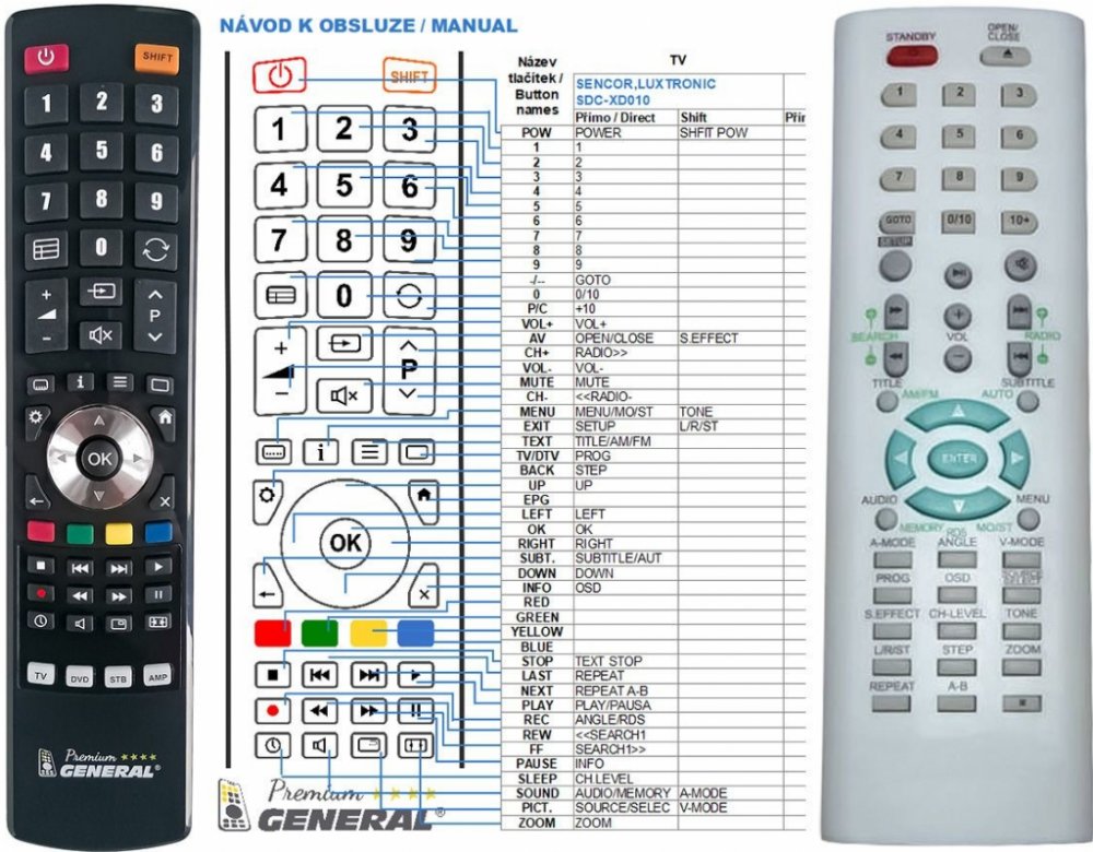 Náhradní dálkový ovladač HYUNDAI MSD253 - 100% náhrada 1:1 za originální dálkový ovladač. Dálkový ovladač byl vyvinut speciálně na míru pro tyto modely značky HYUNDAI:MSD-253, MSD253. (Nemusí zde být uvedeny úplně všechny kompatibilní modely. Pokud si nejste jisti, sdělte nám svůj model (použijte online chat, e-mail, telefon), neprodleně zkontrolujeme a ověříme, zda je tento ovladač kompatibilní s Vaším přístrojem. Za poskytnutou informaci ručíme.) Ovladač je dodáván ve verzi značkového dálkového ovladače General Premium (zobrazen vlevo). Garantujeme Vám, že dostanete ovladač, který plně nahradí Váš původní originální ovladač a bude mít naprosto všechny funkce stejné.Není to univerzální ovladač, ale ovladač, který je naprogramován a přímo určen pro modely přístrojů uvedené výše. Není třeba žádné párování, žádné kódy. Obdržíte od nás ovladač, který je připraven k použití - jediné, co musíte udělat, je vložit baterie a ovladač hned funguje. Podívejte se na obrázek ovladače a ujistěte se, že jsou v tabulce všechny funkce jako na původním originálním ovladači. Jedná se o plnohodnotný náhradní dálkový ovladač (není to „univerzál“). Má naprosto všechny funkce přesně jako originální ovladač. Záruční lhůta na ovladač je 3 roky. Dodáván také jednoduchý návod s mapováním funkcí. DOPLŇKOVÁ FUNKCE: Tento dálkový ovladač je možno naprogramovat na 1-4 zařízení (celkem tedy 4). Budete moci jedním ovladačem ovládat několik různých přístrojů jedním ovladačem. Pokud nám do komentáře v objednávce napíšete modely dalších přístrojů, naprogramujeme Vám ovladač na všechny. Za tuto doplňkovou službu bude naúčtován příplatek k ceně ovladače 50 Kč: více informacíV případě, že v budoucnu vyměníte/obměníte Vaši domácí elektroniku, jsme schopni Vám tento ovladač přeprogramovat na naprosto jakékoliv nové/á zařízení. Ovladač General přežije Váš stávající přístroj!