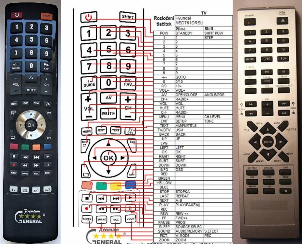 Náhradní dálkový ovladač HYUNDAI MSD761DRSU - 100% náhrada 1:1 za originální dálkový ovladač. Dálkový ovladač je určen pro tyto modely HYUNDAI:MSD 761 DRSU, MSD-761-DRSU, MSD761DRSU. (Nemusí zde být uvedeny úplně všechny kompatibilní modely. Pokud si nejste jisti, sdělte nám svůj model (použijte online chat, e-mail, telefon), neprodleně zkontrolujeme a ověříme, zda je tento ovladač kompatibilní s Vaším přístrojem. Za poskytnutou informaci ručíme.) Ovladač je dodáván ve verzi značkového dálkového ovladače General Premium (zobrazen vlevo). Garantujeme Vám, že dostanete ovladač, který plně nahradí Váš původní originální ovladač a bude mít naprosto všechny funkce stejné.Není to univerzální ovladač, ale ovladač, který je naprogramován a přímo určen pro modely přístrojů uvedené výše. Není třeba žádné párování, žádné kódy. Obdržíte od nás ovladač, který je připraven k použití - jediné, co musíte udělat, je vložit baterie a ovladač hned funguje. Podívejte se na obrázek ovladače a ujistěte se, že jsou v tabulce všechny funkce jako na původním originálním ovladači. Jedná se o plnohodnotný náhradní dálkový ovladač (není to „univerzál“). Má naprosto všechny funkce přesně jako originální ovladač. Záruční lhůta na ovladač je 3 roky. Dodáván také jednoduchý návod s mapováním funkcí. DOPLŇKOVÁ FUNKCE: Tento dálkový ovladač je možno naprogramovat na 1-4 zařízení (celkem tedy 4). Budete moci jedním ovladačem ovládat několik různých přístrojů jedním ovladačem. Pokud nám do komentáře v objednávce napíšete modely dalších přístrojů, naprogramujeme Vám ovladač na všechny. Za tuto doplňkovou službu bude naúčtován příplatek k ceně ovladače 50 Kč: více informacíV případě, že v budoucnu vyměníte/obměníte Vaši domácí elektroniku, jsme schopni Vám tento ovladač přeprogramovat na naprosto jakékoliv nové/á zařízení. Ovladač General přežije Váš stávající přístroj!