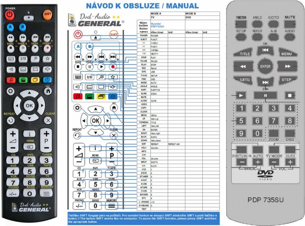 Náhradní dálkový ovladač HYUNDAI PDP735SU - 100% náhrada 1:1 za originální dálkový ovladač. Dálkový ovladač byl vyvinut speciálně na míru pro tyto modely značky HYUNDAI:PDP 735 SU, PDP 735SU, PDP735SU. (Nemusí zde být uvedeny úplně všechny kompatibilní modely. Pokud si nejste jisti, sdělte nám svůj model (použijte online chat, e-mail, telefon), neprodleně zkontrolujeme a ověříme, zda je tento ovladač kompatibilní s Vaším přístrojem. Za poskytnutou informaci ručíme.) Ovladač je dodáván ve verzi značkového dálkového ovladače General DVD/AUDIO (zobrazen vlevo). Garantujeme Vám, že dostanete ovladač, který plně nahradí Váš původní originální ovladač a bude mít naprosto všechny funkce stejné.Není to univerzální ovladač, ale ovladač, který je naprogramován a přímo určen pro modely přístrojů uvedené výše. Není třeba žádné párování, žádné kódy. Obdržíte od nás ovladač, který je připraven k použití - jediné, co musíte udělat, je vložit baterie a ovladač hned funguje. Podívejte se na obrázek ovladače a ujistěte se, že jsou v tabulce všechny funkce jako na původním originálním ovladači. Jedná se o plnohodnotný náhradní dálkový ovladač (není to „univerzál“). Má naprosto všechny funkce přesně jako originální ovladač. Záruční lhůta na ovladač je 3 roky. Dodáván také jednoduchý návod s mapováním funkcí. DOPLŇKOVÁ FUNKCE: Tento dálkový ovladač je možno naprogramovat na 1 další přístroj. Budete moci jedním ovladačem ovládat oba přístroje (např. DVD+TV nebo SOUNDBAR+TV apod.). Pokud nám do komentáře v objednávce napíšete model dalšího přístroje, naprogramujeme Vám ovladač na oba. Za tuto doplňkovou službu bude naúčtován příplatek k ceně ovladače 50 Kč: více informací