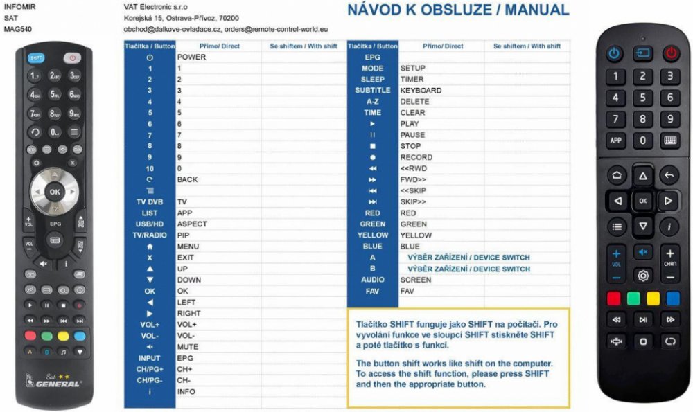 Náhradní dálkový ovladač INFOMIR SRC-4015, MAG420, MAG520, MAG522, MAG540 (SRC4015, MAG420, MAG520, MAG522, MAG540). Je určen pro tyto modely INFOMIR:MAG 420, MAG 520, MAG 522, MAG 540, MAG540 W3. (Nemusí zde být uvedeny úplně všechny kompatibilní modely. Pokud si nejste jisti, sdělte nám svůj model (použijte online chat, e-mail, telefon), neprodleně zkontrolujeme a ověříme, zda je tento ovladač kompatibilní s Vaším přístrojem. Za poskytnutou informaci ručíme.) Dodávaný dálkový ovladač je na obrázku zobrazen vlevo .Vysoká kvalita materiálu a zpracování, naprosto bezporuchový. Všechny naše dálkové ovladače kontrolujeme a testujeme, proto garantujeme jejich spolehlivost, nadstandartně dlouhý dosah signálu a výbornou citlivost tlačítek.Tento dálkový ovladač nemusíte nijak párovat, nevyžaduje žádné nastavování ani kódy. Stačí vložit baterie a funguje se všemi výše uvedenými modely.