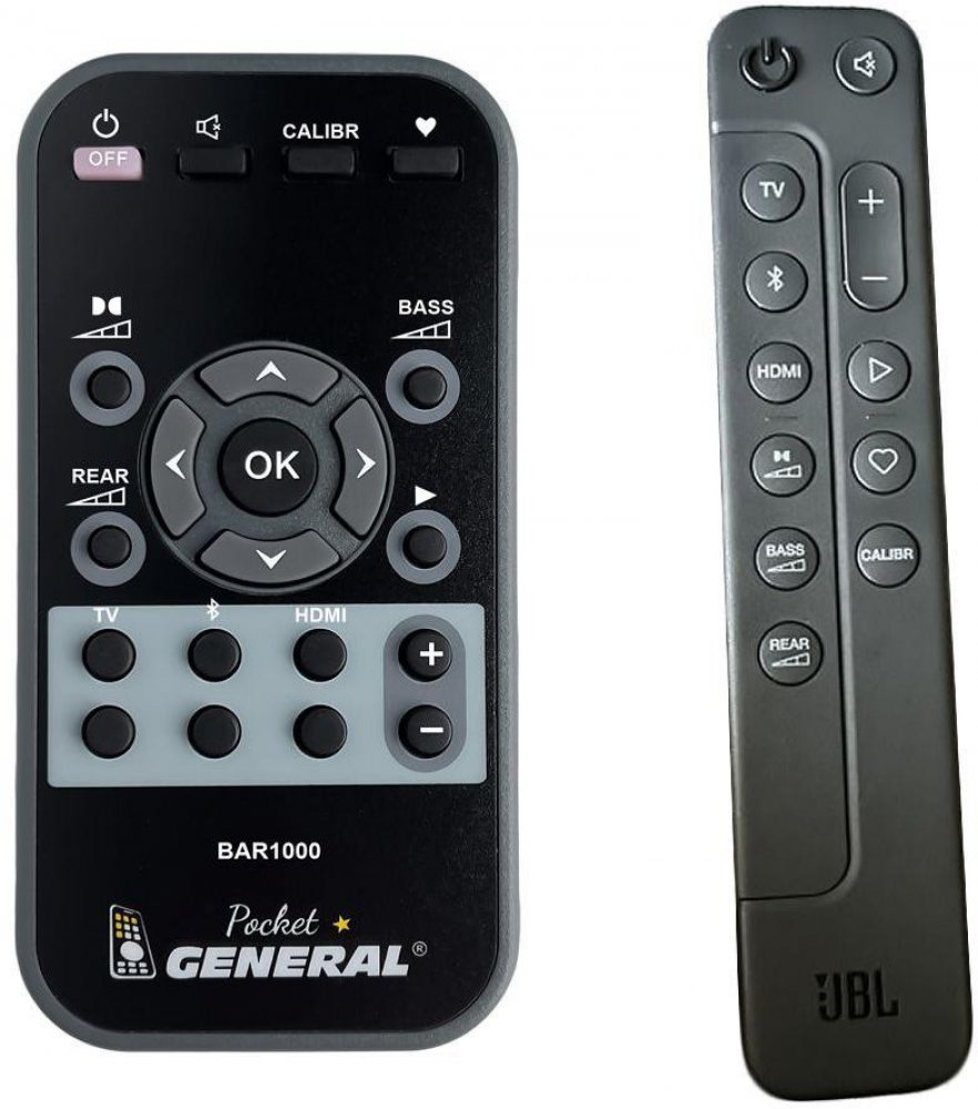 Dálkový ovladač JBL Bar 1000, Bar 800 duplikát 1:1 originálního dálkového ovladače. Dokonalá 1:1 kopie navržená a vyrobená naší firmou – má všechny funkce originálního ovladače pro tyto modely značky JBL:BAR 1000, BAR 1300, BAR 800, BAR1000, BAR1300, BAR800. (Nemusí zde být uvedeny úplně všechny kompatibilní modely. Pokud si nejste jisti, sdělte nám svůj model (použijte online chat, e-mail, telefon), neprodleně zkontrolujeme a ověříme, zda je tento ovladač kompatibilní s Vaším přístrojem. Za poskytnutou informaci ručíme.) Dálkový ovladač General POCKET duplikát má naprosto všechny funkce a popisky tlačítek stejné jako originální dálkový ovladač. Není třeba nic nastavovat, žádné kódy, funguje ihned po vložení baterií se všemi výše uvedenými modely.Ovladač je dodáván ve verzi značkového dálkového ovladače General POCKET duplikát (zobrazen vlevo)Jedná se o ovladač vyrobený pro specifické zařízení – NENÍ to univerzální ovladač!Má naprosto všechny funkce jako originální dálkový ovladač.Má stejné popisky tlačítek, jako jste byli zvyklí z originálu.Popisky tlačítek jsou velmi odolné a nejdou seškrábat ani hrubou silou.3 roky záruka.Nulová poruchovost tohoto modelu! Nemáme zádné reklamace a přitom je to náš nejprodávanější ovladač.General POCKET duplikát byl tlačítko po tlačítku navržen a vyroben přesně podle originálního dálkového ovladače na obrázku vpravo. Výroben v naší firmě v Ostravě, vývoj, výroba i atesty v České republice - splňuje CE a ROHS standardy.SNADNÉ INTUITIVNÍ POUŽÍVÁNÍ: Na rozdíl od běžných náhradních ovladačů, General POCKET duplikát má 100% stejné popisky tlačítek jako Váš původní originální dálkový ovladač.Srovnání: Ostatní univerzální nebo programovatelné náhrady mají (kvůli úspoře nákladů) univerzální rozložení s nesprávně označenými tlačítky, a proto potřebují návod (tabulku funkcí), který říká, jaká je skutečná funkce jednotlivých tlačítek. To může způsobovat zmatek a nutnost neustálého vracení se k návodu je pro koncového uživatele obtěžující. Naopak při používání našeho dá..