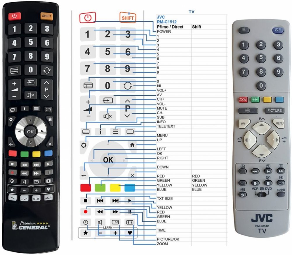 Náhradní dálkový ovladač JVC RM-C1512, RM-C52 (RMC1512, RMC52) - 100procent náhrada 1:1 za originální dálkový ovladač. Dálkový ovladač je určen pro tyto modely JVC: AV-14BM8EES, AV-21FT1SUG, AV-21KT1SEF, AV-21QS5SE, AV-28BT8EES, AV-28GT1B, AV-28KT1SUF, AV-28RT4BU, AV-28RT4SU, AV-29FH1SUG, AV-29FT1BUG, AV-29FT1SUG, AV-32L2, AV-32L2EUGY, AV14BM8EESV, AV20BJ8EES, AV21KJ1SE, AV32L2, AV32L2EUGY, LT-20B70BE, LT-32G80BU, LT-32G80SU, LT-37G80BU, LT-37G80SU, LT-42A80SU, LT-42G80BU, LT-42G80SU. (Nemusí zde být uvedeny úplně všechny kompatibilní modely. Pokud si nejste jisti, sdělte nám svůj model (použijte online chat, e-mail, telefon), neprodleně zkontrolujeme a ověříme, zda je tento ovladač kompatibilní s Vaším přístrojem. Za poskytnutou informaci ručíme.) Ovladač je dodáván ve verzi značkového dálkového ovladače General Premium (zobrazen vlevo). Garantujeme Vám, že dostanete ovladač, který plně nahradí Váš původní originální ovladač a bude mít naprosto všechny funkce. Není to univerzální ovladač, ale ovladač, který je naprogramován a přímo určen pro modely přístrojů uvedené výše. Není třeba žádné párování, žádné kódy. Obdržíte od nás ovladač, který je připraven k použití - jediné, co musíte udělat, je vložit baterie a ovladač hned funguje. Podívejte se na obrázek ovladače a ujistěte se, že jsou v tabulce všechny funkce jako na původním originálním ovladači. Jedná se o plnohodnotný náhradní dálkový ovladač (není to „univerzál“). Má naprosto všechny funkce přesně jako originální ovladač. Záruční lhůta na ovladač je 2 roky. Dodáván také jednoduchý návod s mapováním funkcí. DOPLŇKOVÁ FUNKCE: Tento dálkový ovladač je možno naprogramovat na 1-4 zařízení (celkem tedy 4). Budete moci jedním ovladačem ovládat několik různých přístrojů jedním ovladačem. Pokud nám do komentáře v objednávce napíšete modely dalších přístrojů, naprogramujeme Vám ovladač na všechny. Za tuto doplňkovou službu bude naúčtován příplatek k ceně ovladače 50 Kč: více informací V případě, že v budoucnu vyměníte/obměníte Vaši domácí elektroniku, jsme schopni Vám tento ovladač přeprogramovat na naprosto jakékoliv nové/á zařízení. Ovladač General přežije Váš stávající přístroj!