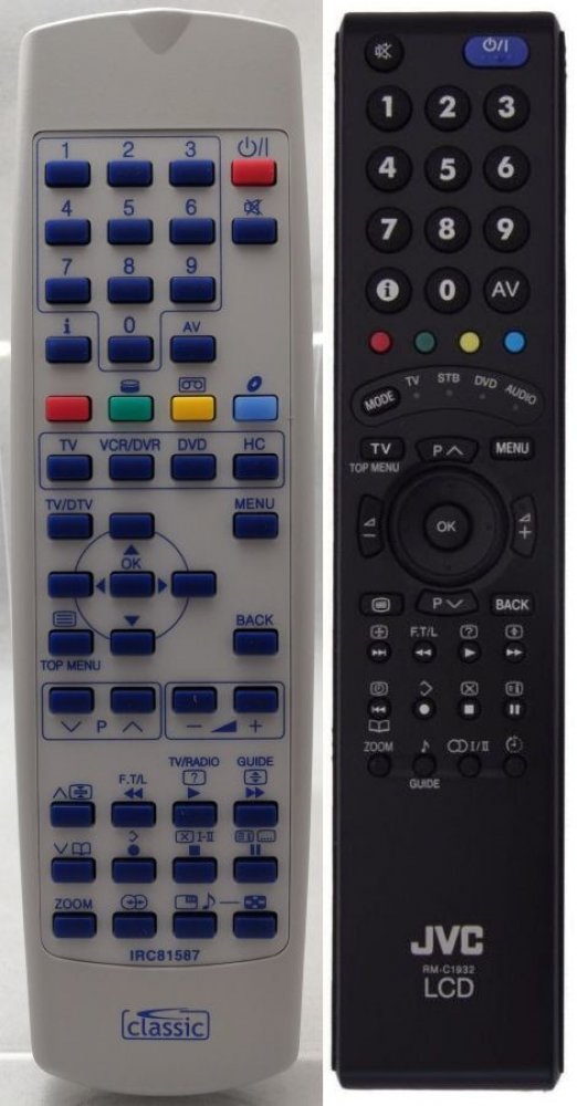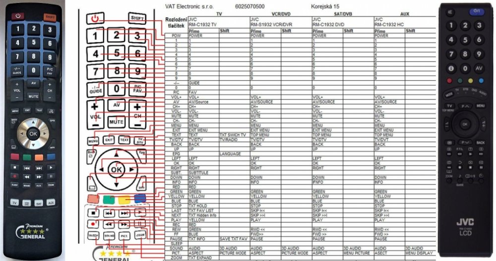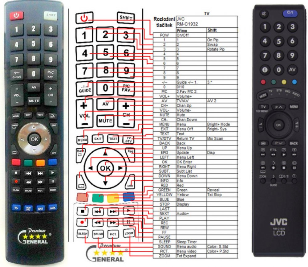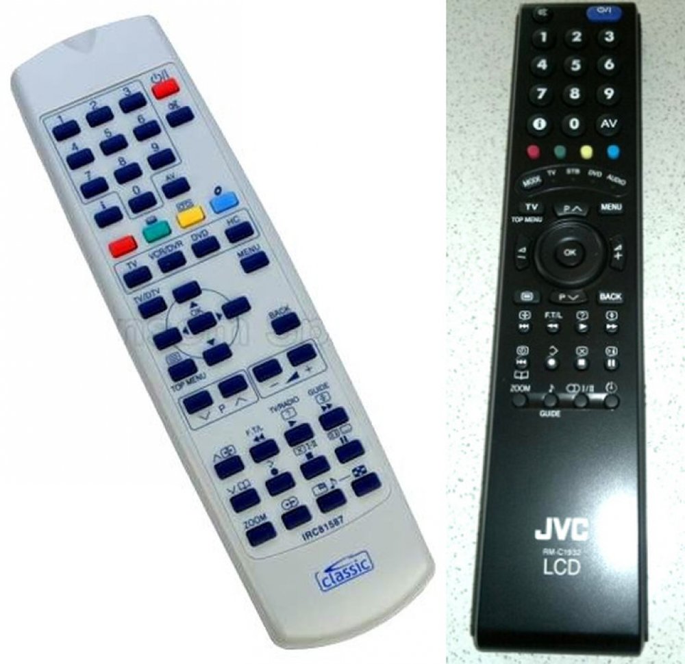 Náhradní dálkový ovladač JVC RM-C1932 (RMC1932) - 100% náhrada 1:1 za originální dálkový ovladač. Dálkový ovladač byl vyvinut speciálně na míru pro tyto modely značky JVC:-42B50BU, 32S60BU, HV28P40BU, HV32P40BU, LT-32DC9BH, LT-42DA9BU, LT-42R10BU, LT23E31SUG, LT26A60BU, LT26S60BU, LT32A61S, LT32A61SU, LT32A90BU, LT32R90BU, LT42R10BU, LT42S90BU, PD42B50BU. (Nemusí zde být uvedeny úplně všechny kompatibilní modely. Pokud si nejste jisti, sdělte nám svůj model (použijte online chat, e-mail, telefon), neprodleně zkontrolujeme a ověříme, zda je tento ovladač kompatibilní s Vaším přístrojem. Za poskytnutou informaci ručíme.) Ovladač je dodáván ve verzi značkového dálkového ovladače General Premium (zobrazen vlevo). Garantujeme Vám, že dostanete ovladač, který plně nahradí Váš původní originální ovladač a bude mít naprosto všechny funkce stejné.Není to univerzální ovladač, ale ovladač, který je naprogramován a přímo určen pro modely přístrojů uvedené výše. Není třeba žádné párování, žádné kódy. Obdržíte od nás ovladač, který je připraven k použití - jediné, co musíte udělat, je vložit baterie a ovladač hned funguje. Podívejte se na obrázek ovladače a ujistěte se, že jsou v tabulce všechny funkce jako na původním originálním ovladači. Jedná se o plnohodnotný náhradní dálkový ovladač (není to „univerzál“). Má naprosto všechny funkce přesně jako originální ovladač. Záruční lhůta na ovladač je 3 roky. Dodáván také jednoduchý návod s mapováním funkcí. DOPLŇKOVÁ FUNKCE: Tento dálkový ovladač je možno naprogramovat na 1-4 zařízení (celkem tedy 4). Budete moci jedním ovladačem ovládat několik různých přístrojů jedním ovladačem. Pokud nám do komentáře v objednávce napíšete modely dalších přístrojů, naprogramujeme Vám ovladač na všechny. Za tuto doplňkovou službu bude naúčtován příplatek k ceně ovladače 50 Kč: více informacíV případě, že v budoucnu vyměníte/obměníte Vaši domácí elektroniku, jsme schopni Vám tento ovladač přeprogramovat na naprosto jakékoliv nové/á ..