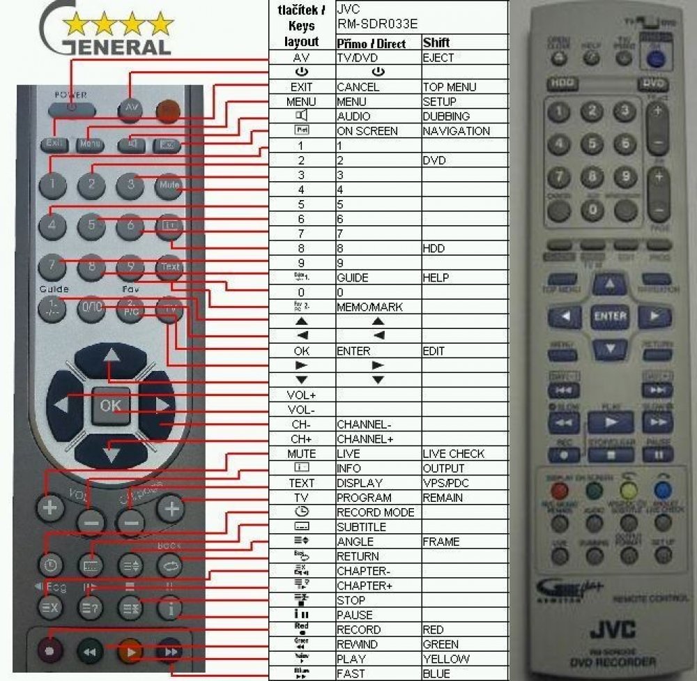 Náhradní dálkový ovladač JVC RM-SDR033E (RMSDR033E) - 100% náhrada 1:1 za originální dálkový ovladač. Dálkový ovladač byl vyvinut speciálně na míru pro tyto modely značky JVC:DR-MH300, DRMH300. (Nemusí zde být uvedeny úplně všechny kompatibilní modely. Pokud si nejste jisti, sdělte nám svůj model (použijte online chat, e-mail, telefon), neprodleně zkontrolujeme a ověříme, zda je tento ovladač kompatibilní s Vaším přístrojem. Za poskytnutou informaci ručíme.) Ovladač je dodáván ve verzi značkového dálkového ovladače General Premium (zobrazen vlevo). Garantujeme Vám, že dostanete ovladač, který plně nahradí Váš původní originální ovladač a bude mít naprosto všechny funkce stejné.Není to univerzální ovladač, ale ovladač, který je naprogramován a přímo určen pro modely přístrojů uvedené výše. Není třeba žádné párování, žádné kódy. Obdržíte od nás ovladač, který je připraven k použití - jediné, co musíte udělat, je vložit baterie a ovladač hned funguje. Podívejte se na obrázek ovladače a ujistěte se, že jsou v tabulce všechny funkce jako na původním originálním ovladači. Jedná se o plnohodnotný náhradní dálkový ovladač (není to „univerzál“). Má naprosto všechny funkce přesně jako originální ovladač. Záruční lhůta na ovladač je 3 roky. Dodáván také jednoduchý návod s mapováním funkcí. DOPLŇKOVÁ FUNKCE: Tento dálkový ovladač je možno naprogramovat na 1-4 zařízení (celkem tedy 4). Budete moci jedním ovladačem ovládat několik různých přístrojů jedním ovladačem. Pokud nám do komentáře v objednávce napíšete modely dalších přístrojů, naprogramujeme Vám ovladač na všechny. Za tuto doplňkovou službu bude naúčtován příplatek k ceně ovladače 50 Kč: více informacíV případě, že v budoucnu vyměníte/obměníte Vaši domácí elektroniku, jsme schopni Vám tento ovladač přeprogramovat na naprosto jakékoliv nové/á zařízení. Ovladač General přežije Váš stávající přístroj!