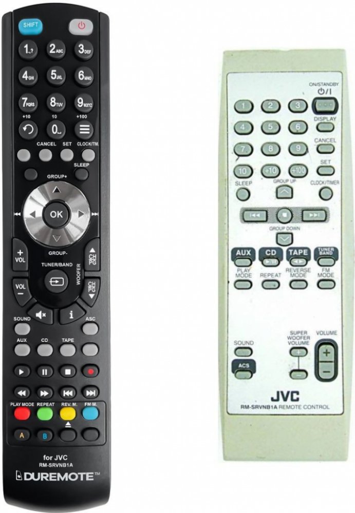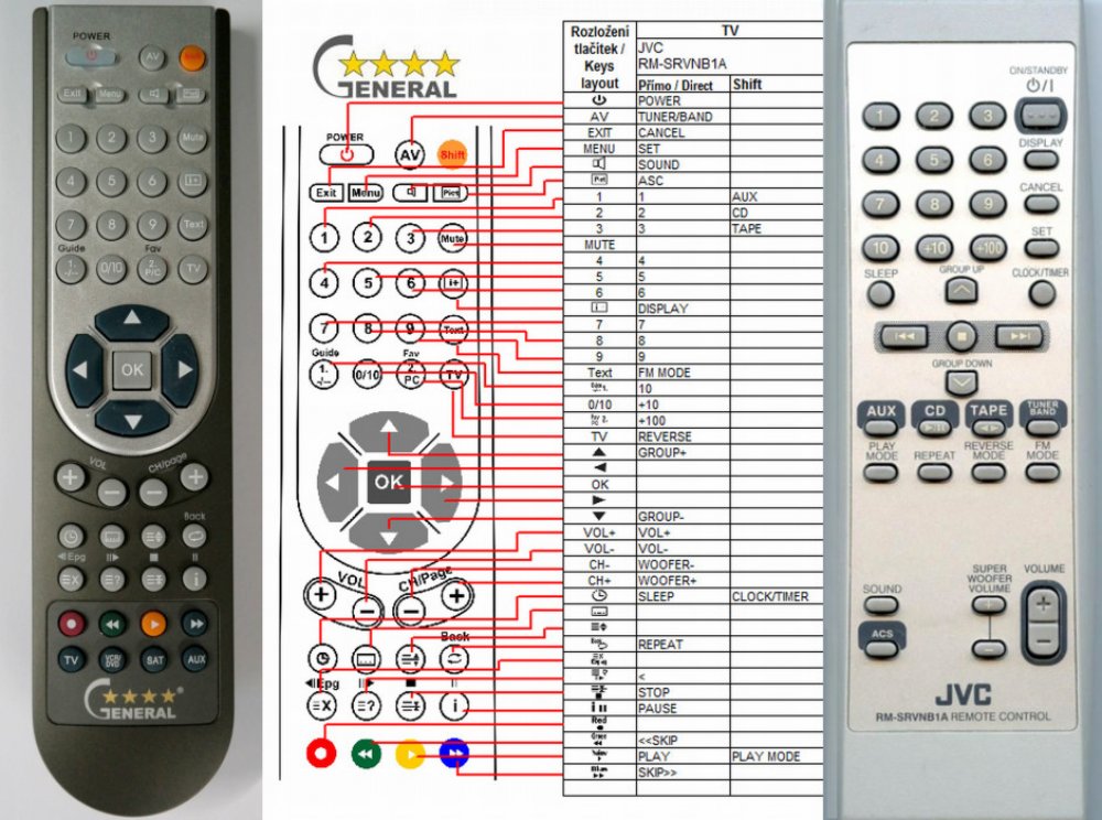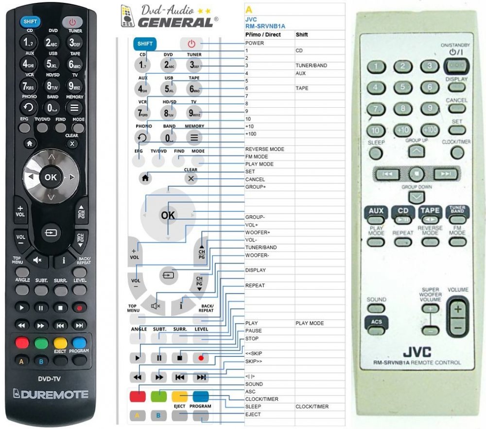 Náhradní dálkový ovladač JVC RM-SRVNB1A (RMSRVNB1A) - 100% náhrada 1:1 za originální dálkový ovladač. Dálkový ovladač byl vyvinut speciálně na míru pro tyto modely značky JVC:RV-NB1, RV-NB10, RV-NB10B, RV-NB10W. (Nemusí zde být uvedeny úplně všechny kompatibilní modely. Pokud si nejste jisti, sdělte nám svůj model (použijte online chat, e-mail, telefon), neprodleně zkontrolujeme a ověříme, zda je tento ovladač kompatibilní s Vaším přístrojem. Za poskytnutou informaci ručíme.) Ovladač je dodáván ve verzi značkového dálkového ovladače General DVD/AUDIO (zobrazen vlevo). Garantujeme Vám, že dostanete ovladač, který plně nahradí Váš původní originální ovladač a bude mít naprosto všechny funkce stejné.Není to univerzální ovladač, ale ovladač, který je naprogramován a přímo určen pro modely přístrojů uvedené výše. Není třeba žádné párování, žádné kódy. Obdržíte od nás ovladač, který je připraven k použití - jediné, co musíte udělat, je vložit baterie a ovladač hned funguje. Podívejte se na obrázek ovladače a ujistěte se, že jsou v tabulce všechny funkce jako na původním originálním ovladači. Jedná se o plnohodnotný náhradní dálkový ovladač (není to „univerzál“). Má naprosto všechny funkce přesně jako originální ovladač. Záruční lhůta na ovladač je 3 roky. Dodáván také jednoduchý návod s mapováním funkcí. DOPLŇKOVÁ FUNKCE: Tento dálkový ovladač je možno naprogramovat na 1 další přístroj. Budete moci jedním ovladačem ovládat oba přístroje (např. DVD+TV nebo SOUNDBAR+TV apod.). Pokud nám do komentáře v objednávce napíšete model dalšího přístroje, naprogramujeme Vám ovladač na oba. Za tuto doplňkovou službu bude naúčtován příplatek k ceně ovladače 50 Kč: více informací