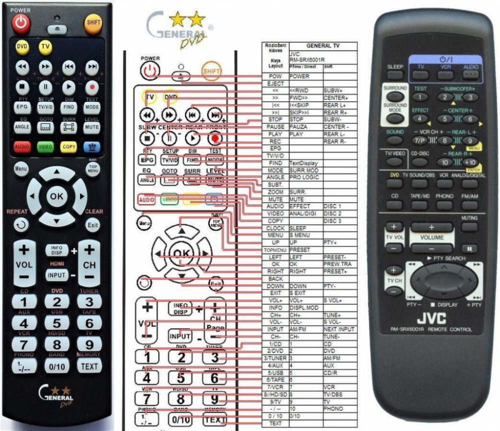 Náhradní dálkový ovladač JVC RM-SRX6001R, RM-SRX6012R (RMSRX6001R, RMSRX6012R) - 100% náhrada 1:1 za originální dálkový ovladač. Dálkový ovladač je určen pro tyto modely JVC:RM-SRX60012R, RM-SRX6001R, RX-6000R, RX-6000RBK, RX-6000VBK, RX-6000VBKJ, RX-6001R, RX-6010RBK, RX-6010RBKB, RX-6012R, RX-6100VBK, RX-6100VBKC, RX6000R, RX6012R. (Nemusí zde být uvedeny úplně všechny kompatibilní modely. Pokud si nejste jisti, sdělte nám svůj model (použijte online chat, e-mail, telefon), neprodleně zkontrolujeme a ověříme, zda je tento ovladač kompatibilní s Vaším přístrojem. Za poskytnutou informaci ručíme.) Ovladač je dodáván ve verzi značkového dálkového ovladače General DVD/AUDIO (zobrazen vlevo). Garantujeme Vám, že dostanete ovladač, který plně nahradí Váš původní originální ovladač a bude mít naprosto všechny funkce.Není to univerzální ovladač, ale ovladač, který je naprogramován a přímo určen pro modely přístrojů uvedené výše. Není třeba žádné párování, žádné kódy. Obdržíte od nás ovladač, který je připraven k použití - jediné, co musíte udělat, je vložit baterie a ovladač hned funguje. Podívejte se na obrázek ovladače a ujistěte se, že jsou v tabulce všechny funkce jako na původním originálním ovladači. Jedná se o plnohodnotný náhradní dálkový ovladač (není to „univerzál“). Má naprosto všechny funkce přesně jako originální ovladač. Záruční lhůta na ovladač je 2 roky. Dodáván také jednoduchý návod s mapováním funkcí. DOPLŇKOVÁ FUNKCE: Tento dálkový ovladač je možno naprogramovat na 1 další přístroj. Budete moci jedním ovladačem ovládat oba přístroje (např. DVD+TV nebo SOUNDBAR+TV apod.). Pokud nám do komentáře v objednávce napíšete model dalšího přístroje, naprogramujeme Vám ovladač na oba. Za tuto doplňkovou službu bude naúčtován příplatek k ceně ovladače 50 Kč: více informací