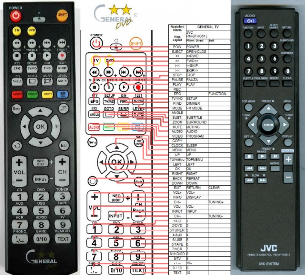 Náhradní dálkový ovladač JVC RM-STHG61J (RMSTHG61J) - 100% náhrada 1:1 za originální dálkový ovladač. Dálkový ovladač byl vyvinut speciálně na míru pro tyto modely značky JVC:XV-THG60, XV-THG61. (Nemusí zde být uvedeny úplně všechny kompatibilní modely. Pokud si nejste jisti, sdělte nám svůj model (použijte online chat, e-mail, telefon), neprodleně zkontrolujeme a ověříme, zda je tento ovladač kompatibilní s Vaším přístrojem. Za poskytnutou informaci ručíme.) Ovladač je dodáván ve verzi značkového dálkového ovladače General DVD/AUDIO (zobrazen vlevo). Garantujeme Vám, že dostanete ovladač, který plně nahradí Váš původní originální ovladač a bude mít naprosto všechny funkce stejné.Není to univerzální ovladač, ale ovladač, který je naprogramován a přímo určen pro modely přístrojů uvedené výše. Není třeba žádné párování, žádné kódy. Obdržíte od nás ovladač, který je připraven k použití - jediné, co musíte udělat, je vložit baterie a ovladač hned funguje. Podívejte se na obrázek ovladače a ujistěte se, že jsou v tabulce všechny funkce jako na původním originálním ovladači. Jedná se o plnohodnotný náhradní dálkový ovladač (není to „univerzál“). Má naprosto všechny funkce přesně jako originální ovladač. Záruční lhůta na ovladač je 3 roky. Dodáván také jednoduchý návod s mapováním funkcí. DOPLŇKOVÁ FUNKCE: Tento dálkový ovladač je možno naprogramovat na 1 další přístroj. Budete moci jedním ovladačem ovládat oba přístroje (např. DVD+TV nebo SOUNDBAR+TV apod.). Pokud nám do komentáře v objednávce napíšete model dalšího přístroje, naprogramujeme Vám ovladač na oba. Za tuto doplňkovou službu bude naúčtován příplatek k ceně ovladače 50 Kč: více informací