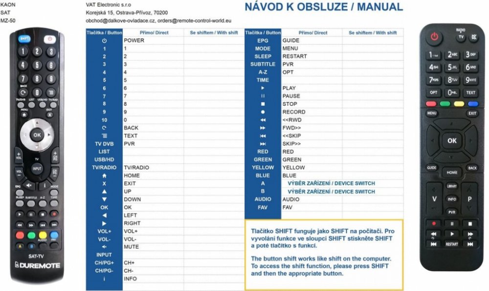 Náhradní dálkový ovladač KAON MZ-50, MZ-52, MZ-102, MZ-120 (MZ50, MZ52, MZ102, MZ120) - 100% náhrada 1:1 za originální dálkový ovladač. Dokonalá 1:1 kopie navržená a vyrobená naší firmou – má všechny funkce originálního ovladače pro tyto modely značky KAON:MZ-102, MZ-104, MZ-120, MZ-50, MZ102, MZ120, MZ50. (Nemusí zde být uvedeny úplně všechny kompatibilní modely. Pokud si nejste jisti, sdělte nám svůj model (použijte online chat, e-mail, telefon), neprodleně zkontrolujeme a ověříme, zda je tento ovladač kompatibilní s Vaším přístrojem. Za poskytnutou informaci ručíme.) Ovladač je dodáván ve verzi značkového dálkového ovladače General Duremote (zobrazen vlevo). Garantujeme Vám, že dostanete ovladač, který plně nahradí Váš původní originální ovladač a bude mít naprosto všechny funkce stejné.Není to univerzální ovladač, ale ovladač, který je naprogramován a přímo určen pro modely přístrojů uvedené výše. Není třeba žádné párování, žádné kódy. Obdržíte od nás ovladač, který je připraven k použití - jediné, co musíte udělat, je vložit baterie a ovladač hned funguje. Podívejte se na obrázek ovladače a ujistěte se, že jsou v tabulce všechny funkce jako na původním originálním ovladači. Jedná se o plnohodnotný náhradní dálkový ovladač (není to „univerzál“). Má naprosto všechny funkce přesně jako originální ovladač. Záruční lhůta na ovladač je 3 roky. Dodáván také jednoduchý návod s mapováním funkcí. DOPLŇKOVÁ FUNKCE: Tento dálkový ovladač je možno naprogramovat na 1 další přístroj. Budete moci jedním ovladačem ovládat oba přístroje. Pokud nám do komentáře v objednávce napíšete model dalšího přístroje, naprogramujeme Vám ovladač na oba. Za tuto doplňkovou službu bude naúčtován příplatek k ceně ovladače 50 Kč: více informací