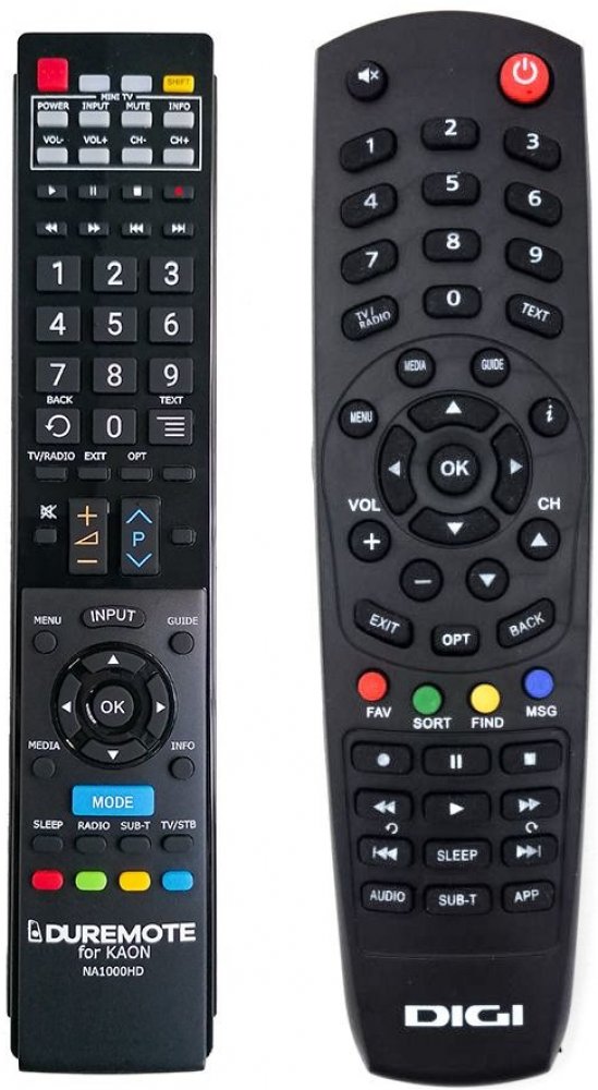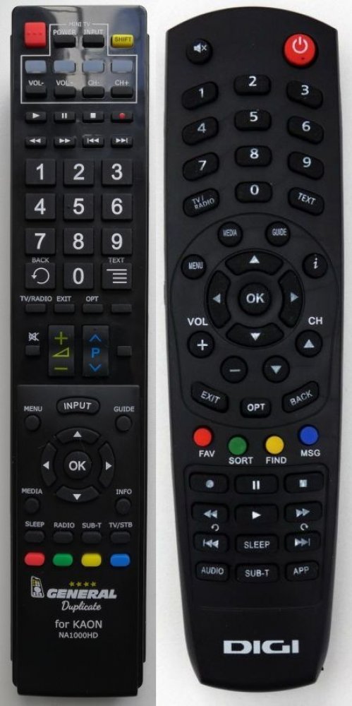 Dálkový ovladač KAON NA1000HD, NA1170 duplikát 1:1 originálního dálkového ovladače. Dálkový ovladač je určen pro tyto modely KAON:NA-1000HD, NA-1170, NA1000 HD, NA1000HD, NA1170. (Nemusí zde být uvedeny úplně všechny kompatibilní modely. Pokud si nejste jisti, sdělte nám svůj model (použijte online chat, e-mail, telefon), neprodleně zkontrolujeme a ověříme, zda je tento ovladač kompatibilní s Vaším přístrojem. Za poskytnutou informaci ručíme.) Dálkový ovladač General Duremote má naprosto všechny funkce a popisky tlačítek stejné jako originální dálkový ovladač. Není třeba nic nastavovat, žádné kódy, funguje ihned po vložení baterií se všemi výše uvedenými modely.Ovladač je dodáván ve verzi značkového dálkového ovladače General Duremote (zobrazen vlevo)DUPLIKÁT 2 v 1: Tento ovladač má sekci tlačítek MINI-TV pro funkce, které jej můžete naučit z Vašeho TV ovladače. To znamená, že jedním ovladačem můžete ovládat 2 přístroje, například set top box + základní funkce TV. Způsob učení tlačítek naleznete v přiloženém návodu v krabičce, ve které Vám bude ovladač dodán. Jedná se o ovladač vyrobený pro specifické zařízení – NENÍ to univerzální ovladač! Má naprosto všechny funkce jako originální dálkový ovladač. Má stejné popisky tlačítek, jako jste byli zvyklí z originálu. Popisky tlačítek jsou velmi odolné a nejdou seškrábat ani hrubou silou. 2 roky záruka.General Duremote byl navržen a vyroben přesně podle originálního dálkového ovladače tlačítko po tlačítku. Ovladač je vyvinut a testován v České republice a podléhá CE a ROHS standardům. SNADNÉ INTUITIVNÍ POUŽÍVÁNÍ: Na rozdíl od běžných náhradních ovladačů, General Duremote má 100% odpovídající popisky tlačítek jako na originálním ovladači. Srovnání: Jiné univerzální nebo programovatelné náhrady mají kvůli snížení nákladů názvy/popisky a rozložení tlačítek univerzální, popisky tlačítek často neodpovídají funkci tlačítka a vyžadují tedy návody k použití. To často vede k nejasnostem, co které tlačítko dělá a stálá potřeba manuálu je ve..