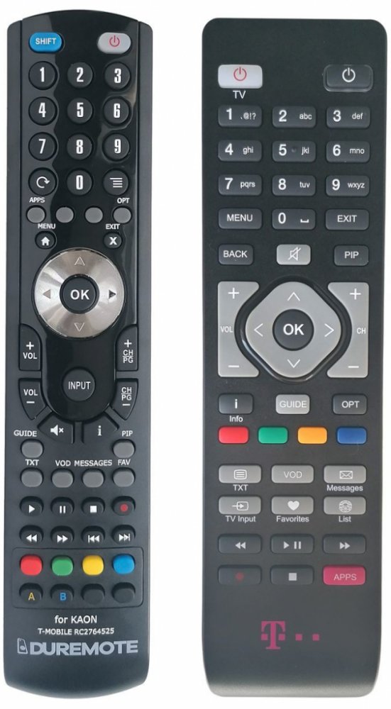 Dálkový ovladač T-MOBILE RC2764525 (TMOBILE RC2764525) duplikát 1:1 originálního dálkového ovladače. Dokonalá 1:1 kopie navržená a vyrobená naší firmou – má všechny funkce originálního ovladače pro tyto modely značky T-MOBILE:KAON 7356. (Nemusí zde být uvedeny úplně všechny kompatibilní modely. Pokud si nejste jisti, sdělte nám svůj model (použijte online chat, e-mail, telefon), neprodleně zkontrolujeme a ověříme, zda je tento ovladač kompatibilní s Vaším přístrojem. Za poskytnutou informaci ručíme.) Dálkový ovladač General Duremote má naprosto všechny funkce a popisky tlačítek stejné jako originální dálkový ovladač. Není třeba nic nastavovat, žádné kódy, funguje ihned po vložení baterií se všemi výše uvedenými modely.Ovladač je dodáván ve verzi značkového dálkového ovladače General Duremote (zobrazen vlevo)Jedná se o ovladač vyrobený pro specifické zařízení – NENÍ to univerzální ovladač!Má naprosto všechny funkce jako originální dálkový ovladač.Má stejné popisky tlačítek, jako jste byli zvyklí z originálu.Popisky tlačítek jsou velmi odolné a nejdou seškrábat ani hrubou silou.3 roky záruka.Nulová poruchovost tohoto modelu! Nemáme zádné reklamace a přitom je to náš nejprodávanější ovladač.General Duremote byl tlačítko po tlačítku navržen a vyroben přesně podle originálního dálkového ovladače na obrázku vpravo. Výroben v naší firmě v Ostravě, vývoj, výroba i atesty v České republice - splňuje CE a ROHS standardy.SNADNÉ INTUITIVNÍ POUŽÍVÁNÍ: Na rozdíl od běžných náhradních ovladačů, General Duremote má 100% stejné popisky tlačítek jako Váš původní originální dálkový ovladač.Srovnání: Ostatní univerzální nebo programovatelné náhrady mají (kvůli úspoře nákladů) univerzální rozložení s nesprávně označenými tlačítky, a proto potřebují návod (tabulku funkcí), který říká, jaká je skutečná funkce jednotlivých tlačítek. To může způsobovat zmatek a nutnost neustálého vracení se k návodu je pro koncového uživatele obtěžující. Naopak při používání našeho dálkového ovladače General Duremote nahlíže..