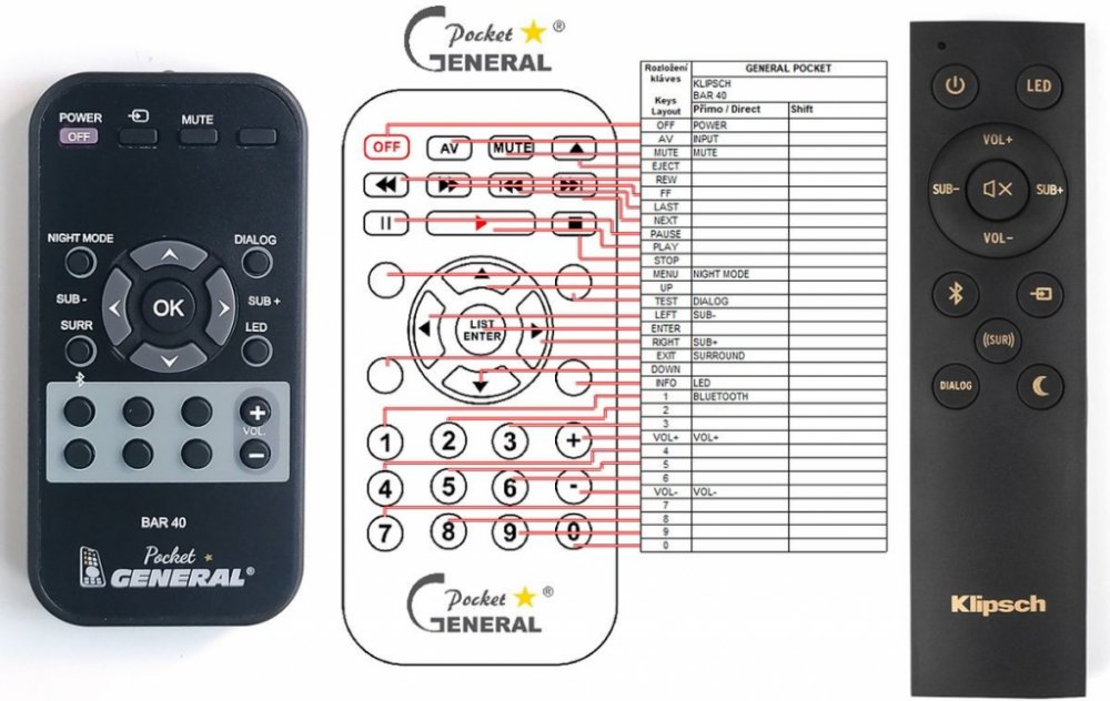 Dálkový ovladač KLIPSCH BAR-40 (BAR40) duplikát 1:1 originálního dálkového ovladače. Dálkový ovladač je určen pro tyto modely KLIPSCH: BAR 40, BAR-40, BAR40. (Nemusí zde být uvedeny úplně všechny kompatibilní modely. Pokud si nejste jisti, sdělte nám svůj model (použijte online chat, e-mail, telefon), neprodleně zkontrolujeme a ověříme, zda je tento ovladač kompatibilní s Vaším přístrojem. Za poskytnutou informaci ručíme.) Dálkový ovladač General POCKET duplikát má naprosto všechny funkce a popisky tlačítek stejné jako originální dálkový ovladač. Není třeba nic nastavovat, žádné kódy, funguje ihned po vložení baterií se všemi výše uvedenými modely. Ovladač je dodáván ve verzi značkového dálkového ovladače General POCKET duplikát (zobrazen vlevo) Jedná se o ovladač vyrobený pro specifické zařízení – NENÍ to univerzální ovladač! Má naprosto všechny funkce jako originální dálkový ovladač. Má stejné popisky tlačítek, jako jste byli zvyklí z originálu. Popisky tlačítek jsou velmi odolné a nejdou seškrábat ani hrubou silou. 2 roky záruka. General POCKET duplikát byl navržen a vyroben přesně podle originálního dálkového ovladače tlačítko po tlačítku. Ovladač je vyvinut a testován v České republice a podléhá CE a ROHS standardům. SNADNÉ INTUITIVNÍ POUŽÍVÁNÍ: Na rozdíl od běžných náhradních ovladačů, General POCKET duplikát má 100procent odpovídající popisky tlačítek jako na originálním ovladači. Srovnání: Jiné univerzální nebo programovatelné náhrady mají kvůli snížení nákladů názvy/popisky a rozložení tlačítek univerzální, popisky tlačítek často neodpovídají funkci tlačítka a vyžadují tedy návody k použití. To často vede k nejasnostem, co které tlačítko dělá a stálá potřeba manuálu je velmi obtěžující. S ovladačem General POCKET duplikát žádný návod nepotřebujete, tlačítko dělá přesně to, co symbolizuje jeho popisek. GARANTUJEME 100procent FUNKČNOST: Narozdíl od jiných náhrad je každý dálkový ovladač General POCKET duplikát přímo v naší firmě navržen a testován na míru pro konkrétní zařízení tak, aby každé tlačítko odpovídalo funkci tlačítka originálního ovladače. Díky tomu můžeme zaručit 100procent funkčnost přesně jako originální ovladač. Samotné šasi bylo navrženo a vyvíjeno tak, aby bylo co nejodolnější a nejspolehlivější. Zároveň však byl kladen důraz na přívětivé rozložení tlačítek a popisky tlačítek jsou optimalizovány pro dobrou viditelnost. Materiály a součástky byly podrobeny důkladným testům, aby odolaly i tomu nejtvrdšímu zacházení a poskytovaly tak dlouhodobou životnost. Názvy tlačítek jsou na ovladači natištěny moderní technologií v naší firmě (naše vlastní know-how). Tisk je extrémně odolný a nelze jej setřít ani oškrábat. DUPLIKÁT originálního dálkového ovladače má naprosto stejné funkce a stejné názvy tlačítek jako Váš původní originální ovladač. Nemusíte nic nastavovat, po vložení baterií bude okamžitě fungovat, ovladač je již nakonfigurován tak, aby fungoval na modely uvedené výše. Nápisy na tlačítkách přesně odpovídají funkcím tlačítek, tiskneme je přesně podle originálního ovladače. Narozdíl od všech univerzálních a programovatelných náhrad, kde jsou názvy tlačítek univerzální a pro uživatele matoucí. Popisky jsou natištěny technicky vyspělou technologií v naší provozovně (naše know-how), jsou extrémně odolné, nejdou setřít ani seškrábat (např. nehtem). Opravdu jsme schopni vyrobit jakýkoliv dálkový ovladač! Splníme i požadavky na exotické ovladače, které nejsou (zatím) v naší nabídce. DUPLIKÁT = Nejlepší poměr cena/výkon. DOPORUČUJEME! DUPLIKÁT originálního dálkového ovladače má naprosto stejné funkce a stejné názvy tlačítek jako Váš původní originální ovladač. Nemusíte nic nastavovat, po vložení baterií bude okamžitě fungovat, ovladač je již nakonfigurován tak, aby fungoval na modely uvedené níže. Nápisy na tlacitkach přesně odpovídají funkcím tlačítek, tiskneme je přesně podle oriignálního ovladače. Narozdil od všech univerzalnich a programovatelnych náhrad, kde jsou názvy tlačítek univerzální a pro uživatele matoucí. Popisky jsou natištěny technicky vyspělou technologií v naší provozovně (naše know-how), jsou extrémně odolné, nejdou setřít ani seškrábat (např.nehtem). Opravdu jsme schopni vyrobit jakýkoliv dálkový ovladač! Splníme i požadavky na exotické ovladače, které nejsou (zatím :) v naší nabídce. DUPLIKÁT = Nejlepší poměr cena/výkon. DOPORUČUJEME!