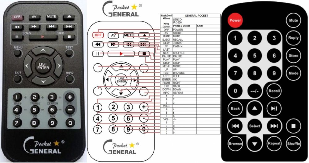 Náhradní dálkový ovladač LENCO IR-3000 (IR3000) - 100% náhrada 1:1 za originální dálkový ovladač. Dálkový ovladač byl vyvinut speciálně na míru pro tyto modely značky LENCO:IR-3000, IR3000. (Nemusí zde být uvedeny úplně všechny kompatibilní modely. Pokud si nejste jisti, sdělte nám svůj model (použijte online chat, e-mail, telefon), neprodleně zkontrolujeme a ověříme, zda je tento ovladač kompatibilní s Vaším přístrojem. Za poskytnutou informaci ručíme.) Ovladač je dodáván ve verzi značkového dálkového ovladače General POCKET (zobrazen vlevo). Garantujeme Vám, že dostanete ovladač, který plně nahradí Váš původní originální ovladač a bude mít naprosto všechny funkce stejné.Není to univerzální ovladač, ale ovladač, který je naprogramován a přímo určen pro modely přístrojů uvedené výše. Není třeba žádné párování, žádné kódy. Obdržíte od nás ovladač, který je připraven k použití - jediné, co musíte udělat, je vložit baterie a ovladač hned funguje. Podívejte se na obrázek ovladače a ujistěte se, že jsou v tabulce všechny funkce jako na původním originálním ovladači. Jedná se o plnohodnotný náhradní dálkový ovladač (není to „univerzál“). Má naprosto všechny funkce přesně jako originální ovladač. Záruční lhůta na ovladač je 3 roky. Dodáván také jednoduchý návod s mapováním funkcí.