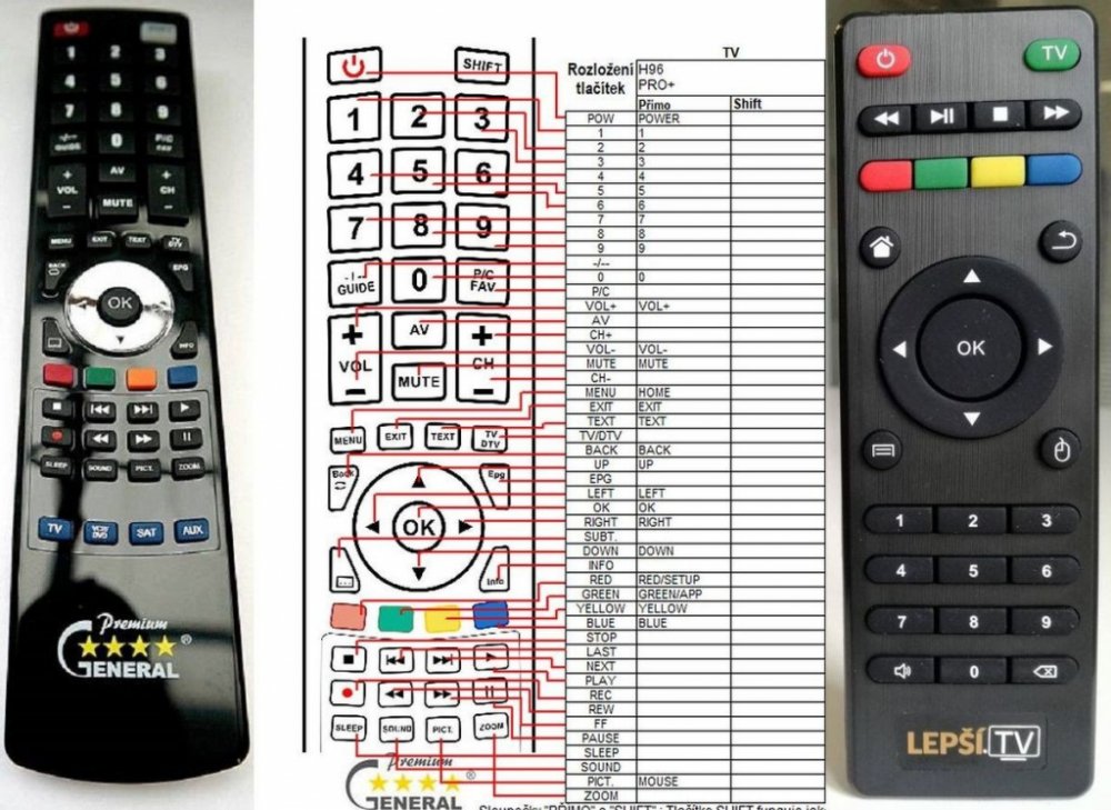 Náhradní dálkový ovladač LepsiTV SET TOP BOX - 100procent náhrada 1:1 za originální dálkový ovladač. Dálkový ovladač je určen pro tyto modely LepsiTV: LEPŠÍ TV, LEPŠÍ-TV, LEPŠÍ.TV, LEPŠÍTV. (Nemusí zde být uvedeny úplně všechny kompatibilní modely. Pokud si nejste jisti, sdělte nám svůj model (použijte online chat, e-mail, telefon), neprodleně zkontrolujeme a ověříme, zda je tento ovladač kompatibilní s Vaším přístrojem. Za poskytnutou informaci ručíme.) Ovladač je dodáván ve verzi značkového dálkového ovladače General Premium (zobrazen vlevo). Garantujeme Vám, že dostanete ovladač, který plně nahradí Váš původní originální ovladač a bude mít naprosto všechny funkce. Není to univerzální ovladač, ale ovladač, který je naprogramován a přímo určen pro modely přístrojů uvedené výše. Není třeba žádné párování, žádné kódy. Obdržíte od nás ovladač, který je připraven k použití - jediné, co musíte udělat, je vložit baterie a ovladač hned funguje. Podívejte se na obrázek ovladače a ujistěte se, že jsou v tabulce všechny funkce jako na původním originálním ovladači. Jedná se o plnohodnotný náhradní dálkový ovladač (není to „univerzál“). Má naprosto všechny funkce přesně jako originální ovladač. Záruční lhůta na ovladač je 2 roky. Dodáván také jednoduchý návod s mapováním funkcí. DOPLŇKOVÁ FUNKCE: Tento dálkový ovladač je možno naprogramovat na 1-4 zařízení (celkem tedy 4). Budete moci jedním ovladačem ovládat několik různých přístrojů jedním ovladačem. Pokud nám do komentáře v objednávce napíšete modely dalších přístrojů, naprogramujeme Vám ovladač na všechny. Za tuto doplňkovou službu bude naúčtován příplatek k ceně ovladače 50 Kč: více informací V případě, že v budoucnu vyměníte/obměníte Vaši domácí elektroniku, jsme schopni Vám tento ovladač přeprogramovat na naprosto jakékoliv nové/á zařízení. Ovladač General přežije Váš stávající přístroj!