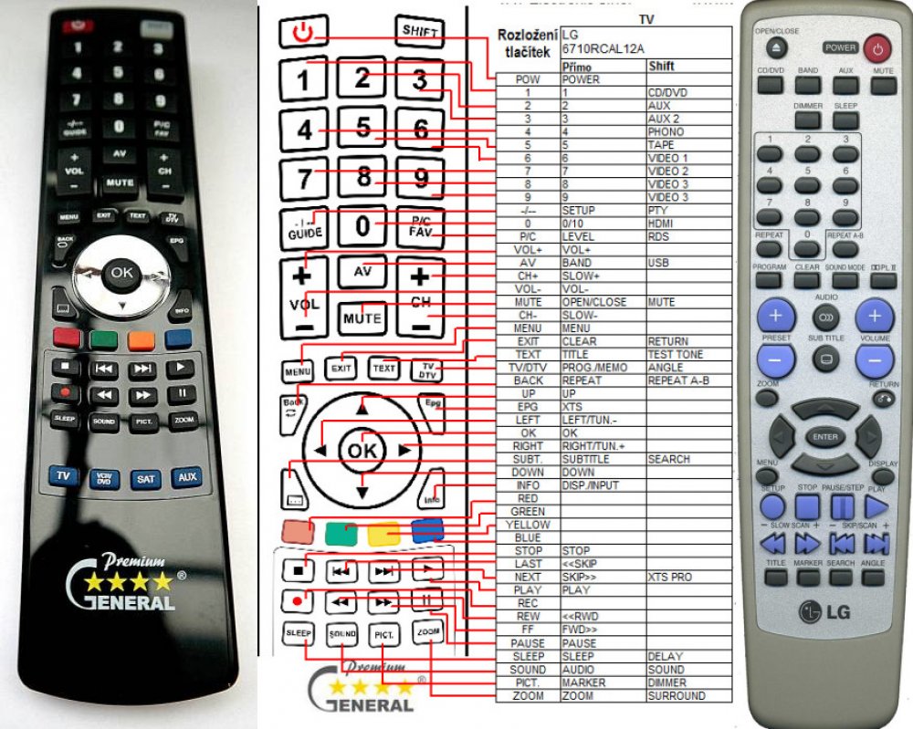 Náhradní dálkový ovladač LG 6710RCAL12A - 100procent náhrada 1:1 za originální dálkový ovladač. Dálkový ovladač je určen pro tyto modely LG: LH-D6235D, LH-T1000D, LH-W5100D. (Nemusí zde být uvedeny úplně všechny kompatibilní modely. Pokud si nejste jisti, sdělte nám svůj model (použijte online chat, e-mail, telefon), neprodleně zkontrolujeme a ověříme, zda je tento ovladač kompatibilní s Vaším přístrojem. Za poskytnutou informaci ručíme.) Ovladač je dodáván ve verzi značkového dálkového ovladače General Premium (zobrazen vlevo). Garantujeme Vám, že dostanete ovladač, který plně nahradí Váš původní originální ovladač a bude mít naprosto všechny funkce. Není to univerzální ovladač, ale ovladač, který je naprogramován a přímo určen pro modely přístrojů uvedené výše. Není třeba žádné párování, žádné kódy. Obdržíte od nás ovladač, který je připraven k použití - jediné, co musíte udělat, je vložit baterie a ovladač hned funguje. Podívejte se na obrázek ovladače a ujistěte se, že jsou v tabulce všechny funkce jako na původním originálním ovladači. Jedná se o plnohodnotný náhradní dálkový ovladač (není to „univerzál“). Má naprosto všechny funkce přesně jako originální ovladač. Záruční lhůta na ovladač je 2 roky. Dodáván také jednoduchý návod s mapováním funkcí. DOPLŇKOVÁ FUNKCE: Tento dálkový ovladač je možno naprogramovat na 1-4 zařízení (celkem tedy 4). Budete moci jedním ovladačem ovládat několik různých přístrojů jedním ovladačem. Pokud nám do komentáře v objednávce napíšete modely dalších přístrojů, naprogramujeme Vám ovladač na všechny. Za tuto doplňkovou službu bude naúčtován příplatek k ceně ovladače 50 Kč: více informací V případě, že v budoucnu vyměníte/obměníte Vaši domácí elektroniku, jsme schopni Vám tento ovladač přeprogramovat na naprosto jakékoliv nové/á zařízení. Ovladač General přežije Váš stávající přístroj!