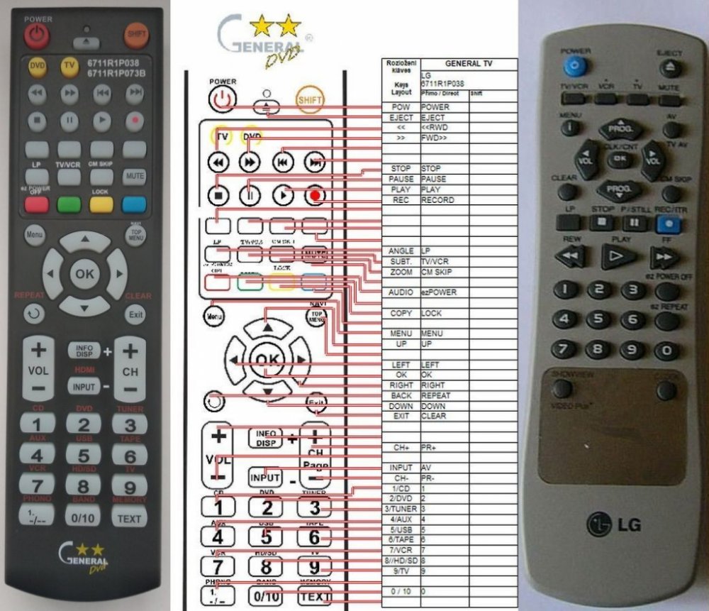 Dálkový ovladač LG 6711R1P038B, 6711R1P038C duplikát 1:1 originálního dálkového ovladače. Dálkový ovladač je určen pro tyto modely LG: LV2378, LV2398, LV2578, LV2579, LV2588, LV2787, LV2798, LV300, LV3760, LV3798, LV3799. (Nemusí zde být uvedeny úplně všechny kompatibilní modely. Pokud si nejste jisti, sdělte nám svůj model (použijte online chat, e-mail, telefon), neprodleně zkontrolujeme a ověříme, zda je tento ovladač kompatibilní s Vaším přístrojem. Za poskytnutou informaci ručíme.) Dálkový ovladač General DVD duplikát má naprosto všechny funkce a popisky tlačítek stejné jako originální dálkový ovladač. Není třeba nic nastavovat, žádné kódy, funguje ihned po vložení baterií se všemi výše uvedenými modely. Ovladač je dodáván ve verzi značkového dálkového ovladače General DVD duplikát (zobrazen vlevo) Jedná se o ovladač vyrobený pro specifické zařízení – NENÍ to univerzální ovladač! Má naprosto všechny funkce jako originální dálkový ovladač. Má stejné popisky tlačítek, jako jste byli zvyklí z originálu. Popisky tlačítek jsou velmi odolné a nejdou seškrábat ani hrubou silou. 2 roky záruka. General DVD duplikát byl navržen a vyroben přesně podle originálního dálkového ovladače tlačítko po tlačítku. Ovladač je vyvinut a testován v České republice a podléhá CE a ROHS standardům. SNADNÉ INTUITIVNÍ POUŽÍVÁNÍ: Na rozdíl od běžných náhradních ovladačů, General DVD duplikát má 100procent odpovídající popisky tlačítek jako na originálním ovladači. Srovnání: Jiné univerzální nebo programovatelné náhrady mají kvůli snížení nákladů názvy/popisky a rozložení tlačítek univerzální, popisky tlačítek často neodpovídají funkci tlačítka a vyžadují tedy návody k použití. To často vede k nejasnostem, co které tlačítko dělá a stálá potřeba manuálu je velmi obtěžující. S ovladačem General DVD duplikát žádný návod nepotřebujete, tlačítko dělá přesně to, co symbolizuje jeho popisek. GARANTUJEME 100procent FUNKČNOST: Narozdíl od jiných náhrad je každý dálkový ovladač General DVD duplikát přímo v naší firmě navržen a testován na míru pro konkrétní zařízení tak, aby každé tlačítko odpovídalo funkci tlačítka originálního ovladače. Díky tomu můžeme zaručit 100procent funkčnost přesně jako originální ovladač. Samotné šasi bylo navrženo a vyvíjeno tak, aby bylo co nejodolnější a nejspolehlivější. Zároveň však byl kladen důraz na přívětivé rozložení tlačítek a popisky tlačítek jsou optimalizovány pro dobrou viditelnost. Materiály a součástky byly podrobeny důkladným testům, aby odolaly i tomu nejtvrdšímu zacházení a poskytovaly tak dlouhodobou životnost. Názvy tlačítek jsou na ovladači natištěny moderní technologií v naší firmě (naše vlastní know-how). Tisk je extrémně odolný a nelze jej setřít ani oškrábat. DUPLIKÁT originálního dálkového ovladače má naprosto stejné funkce a stejné názvy tlačítek jako Váš původní originální ovladač. Nemusíte nic nastavovat, po vložení baterií bude okamžitě fungovat, ovladač je již nakonfigurován tak, aby fungoval na modely uvedené výše. Nápisy na tlačítkách přesně odpovídají funkcím tlačítek, tiskneme je přesně podle originálního ovladače. Narozdíl od všech univerzálních a programovatelných náhrad, kde jsou názvy tlačítek univerzální a pro uživatele matoucí. Popisky jsou natištěny technicky vyspělou technologií v naší provozovně (naše know-how), jsou extrémně odolné, nejdou setřít ani seškrábat (např. nehtem). Opravdu jsme schopni vyrobit jakýkoliv dálkový ovladač! Splníme i požadavky na exotické ovladače, které nejsou (zatím) v naší nabídce. DUPLIKÁT = Nejlepší poměr cena/výkon. DOPORUČUJEME! DUPLIKÁT originálního dálkového ovladače má naprosto stejné funkce a stejné názvy tlačítek jako Váš původní originální ovladač. Nemusíte nic nastavovat, po vložení baterií bude okamžitě fungovat, ovladač je již nakonfigurován tak, aby fungoval na modely uvedené níže. Nápisy na tlacitkach přesně odpovídají funkcím tlačítek, tiskneme je přesně podle oriignálního ovladače. Narozdil od všech univerzalnich a programovatelnych náhrad, kde jsou názvy tlačítek univerzální a pro uživatele matoucí. Popisky jsou natištěny technicky vyspělou technologií v naší provozovně (naše know-how), jsou extrémně odolné, nejdou setřít ani seškrábat (např.nehtem). Opravdu jsme schopni vyrobit jakýkoliv dálkový ovladač! Splníme i požadavky na exotické ovladače, které nejsou (zatím :) v naší nabídce. DUPLIKÁT = Nejlepší poměr cena/výkon. DOPORUČUJEME!