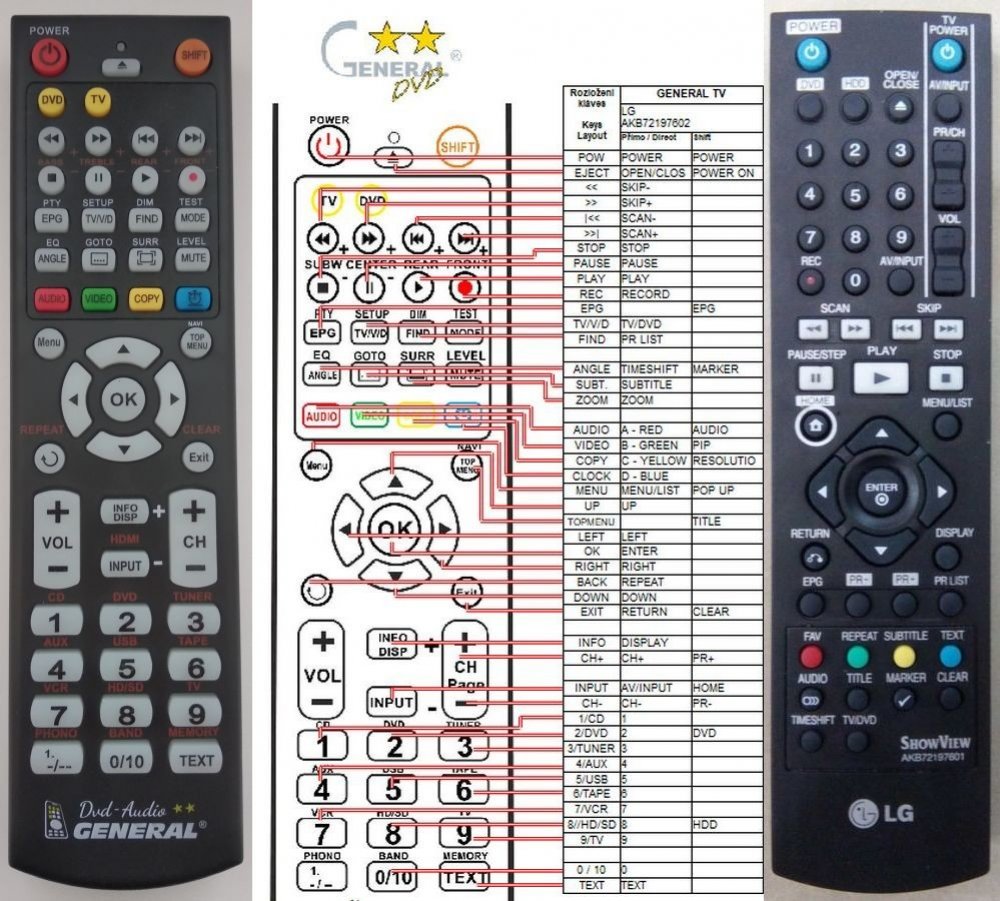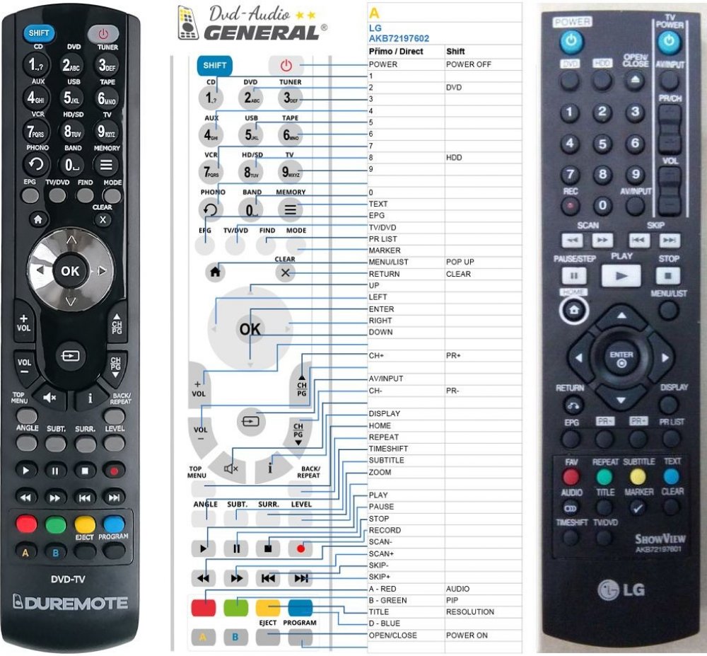 Náhradní dálkový ovladač LG AKB72197601 - 100% náhrada 1:1 za originální dálkový ovladač. Dálkový ovladač byl vyvinut speciálně na míru pro tyto modely značky LG:RH698H, RHT497H, RHT498H, RHT499H. (Nemusí zde být uvedeny úplně všechny kompatibilní modely. Pokud si nejste jisti, sdělte nám svůj model (použijte online chat, e-mail, telefon), neprodleně zkontrolujeme a ověříme, zda je tento ovladač kompatibilní s Vaším přístrojem. Za poskytnutou informaci ručíme.) Ovladač je dodáván ve verzi značkového dálkového ovladače General DVD/AUDIO (zobrazen vlevo). Garantujeme Vám, že dostanete ovladač, který plně nahradí Váš původní originální ovladač a bude mít naprosto všechny funkce stejné.Není to univerzální ovladač, ale ovladač, který je naprogramován a přímo určen pro modely přístrojů uvedené výše. Není třeba žádné párování, žádné kódy. Obdržíte od nás ovladač, který je připraven k použití - jediné, co musíte udělat, je vložit baterie a ovladač hned funguje. Podívejte se na obrázek ovladače a ujistěte se, že jsou v tabulce všechny funkce jako na původním originálním ovladači. Jedná se o plnohodnotný náhradní dálkový ovladač (není to „univerzál“). Má naprosto všechny funkce přesně jako originální ovladač. Záruční lhůta na ovladač je 3 roky. Dodáván také jednoduchý návod s mapováním funkcí. DOPLŇKOVÁ FUNKCE: Tento dálkový ovladač je možno naprogramovat na 1 další přístroj. Budete moci jedním ovladačem ovládat oba přístroje (např. DVD+TV nebo SOUNDBAR+TV apod.). Pokud nám do komentáře v objednávce napíšete model dalšího přístroje, naprogramujeme Vám ovladač na oba. Za tuto doplňkovou službu bude naúčtován příplatek k ceně ovladače 50 Kč: více informací