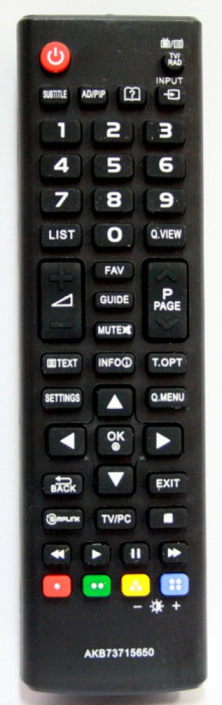 Náhradní dálkový ovladač LG AKB73715650. Dálkový ovladač byl vyvinut speciálně na míru pro tyto modely značky LG:22MN43D, 26LN450B, 27MA43D-PZ, 29LN450B. (Nemusí zde být uvedeny úplně všechny kompatibilní modely. Pokud si nejste jisti, sdělte nám svůj model (použijte online chat, e-mail, telefon), neprodleně zkontrolujeme a ověříme, zda je tento ovladač kompatibilní s Vaším přístrojem. Za poskytnutou informaci ručíme.) Jedná se o naprosto stejný dálkový ovladač jako originál. Jediný rozdíl je, že nemá logo LG (to je jediný důvod, proč je levnější). Vysoká kvalita materiálu a zpracování, naprosto bezporuchový. Všechny naše dálkové ovladače kontrolujeme a testujeme, proto garantujeme jejich spolehlivost, nadstandartně dlouhý dosah signálu a výbornou citlivost tlačítek.Tento dálkový ovladač nemusíte nijak párovat, nevyžaduje žádné nastavování ani kódy. Stačí vložit baterie a funguje se všemi výše uvedenými modely.