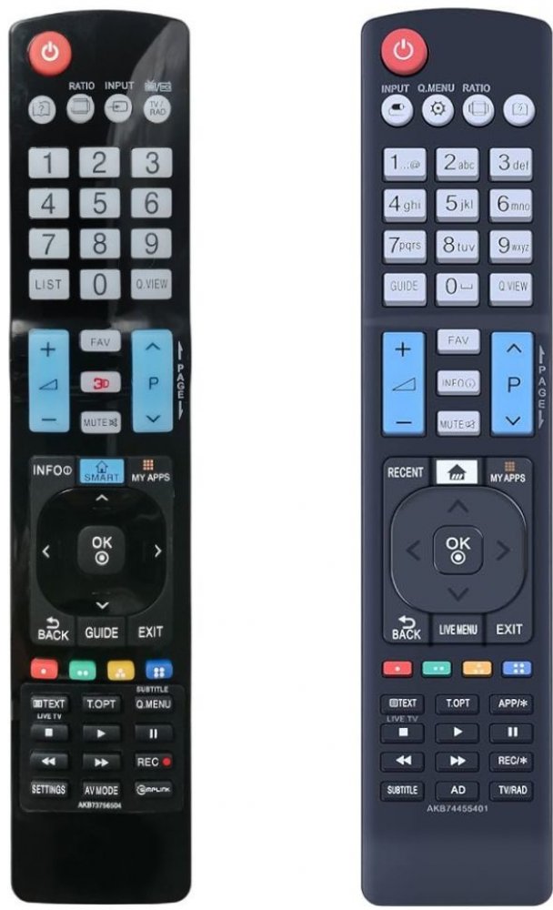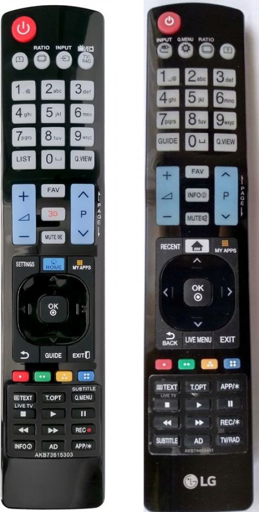 Náhradní dálkový ovladač LG AKB74455401. Dálkový ovladač byl vyvinut speciálně na míru pro tyto modely značky LG:32LF630, 32LF631, 32LF631V, 32LF632, 32LF632V, 32LF650, 32LM6380PLC, 40LF630, 40LF630V, 40LF631, 40LF632, 43LF630, 43LF6309, 43LF630V, 43LF631, 43LF631V, 43LF632, 43LF632V, 49LF630, 49LF631V, 49UF6907, 55LF630, 55LF632. (Nemusí zde být uvedeny úplně všechny kompatibilní modely. Pokud si nejste jisti, sdělte nám svůj model (použijte online chat, e-mail, telefon), neprodleně zkontrolujeme a ověříme, zda je tento ovladač kompatibilní s Vaším přístrojem. Za poskytnutou informaci ručíme.) Byl nahrazen kompatibilním dálkovým ovladačem AKB73615303 (zobrazen vlevo).Vysoká kvalita materiálu a zpracování, naprosto bezporuchový. Všechny naše dálkové ovladače kontrolujeme a testujeme, proto garantujeme jejich spolehlivost, nadstandartně dlouhý dosah signálu a výbornou citlivost tlačítek.Tento dálkový ovladač nemusíte nijak párovat, nevyžaduje žádné nastavování ani kódy. Stačí vložit baterie a funguje se všemi výše uvedenými modely.