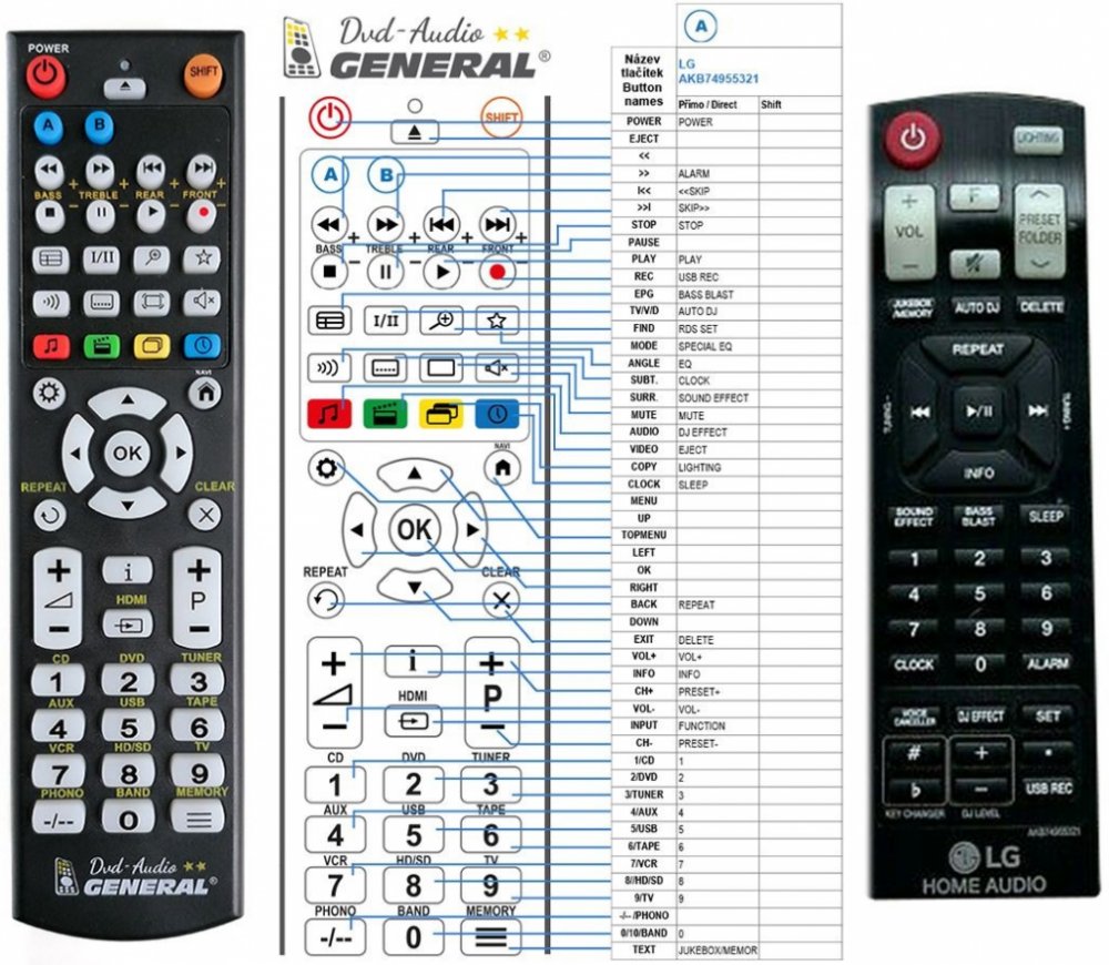 Náhradní dálkový ovladač LG AKB74955321 - 100% náhrada 1:1 za originální dálkový ovladač. Dálkový ovladač byl vyvinut speciálně na míru pro tyto modely značky LG:FH-6, FH6. (Nemusí zde být uvedeny úplně všechny kompatibilní modely. Pokud si nejste jisti, sdělte nám svůj model (použijte online chat, e-mail, telefon), neprodleně zkontrolujeme a ověříme, zda je tento ovladač kompatibilní s Vaším přístrojem. Za poskytnutou informaci ručíme.) Ovladač je dodáván ve verzi značkového dálkového ovladače General DVD/AUDIO (zobrazen vlevo). Garantujeme Vám, že dostanete ovladač, který plně nahradí Váš původní originální ovladač a bude mít naprosto všechny funkce stejné.Není to univerzální ovladač, ale ovladač, který je naprogramován a přímo určen pro modely přístrojů uvedené výše. Není třeba žádné párování, žádné kódy. Obdržíte od nás ovladač, který je připraven k použití - jediné, co musíte udělat, je vložit baterie a ovladač hned funguje. Podívejte se na obrázek ovladače a ujistěte se, že jsou v tabulce všechny funkce jako na původním originálním ovladači. Jedná se o plnohodnotný náhradní dálkový ovladač (není to „univerzál“). Má naprosto všechny funkce přesně jako originální ovladač. Záruční lhůta na ovladač je 3 roky. Dodáván také jednoduchý návod s mapováním funkcí. DOPLŇKOVÁ FUNKCE: Tento dálkový ovladač je možno naprogramovat na 1 další přístroj. Budete moci jedním ovladačem ovládat oba přístroje (např. DVD+TV nebo SOUNDBAR+TV apod.). Pokud nám do komentáře v objednávce napíšete model dalšího přístroje, naprogramujeme Vám ovladač na oba. Za tuto doplňkovou službu bude naúčtován příplatek k ceně ovladače 50 Kč: více informací
