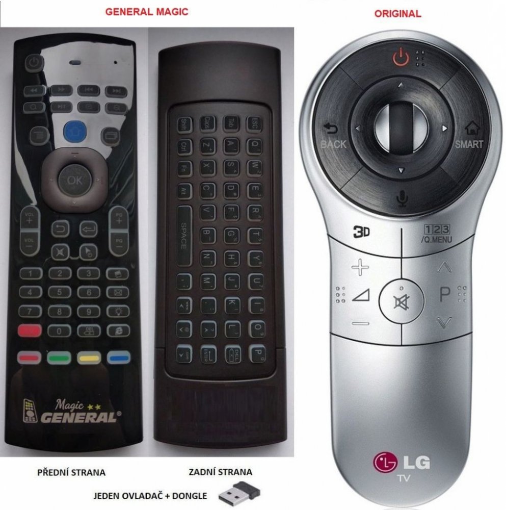 Tento ovladač je dodáván ve verzi luxusního multifunkčního air mouse ovladače s integrovanou klávesnicí General SMART Kompatibilní se všemi chytrými SMART TV Samsung a LG. Jediná podmínka funkčnosti je, že TV musí mít USB konektor. Odzkoušeno našimi techniky, kteří jsou z tohoto ovladače nadšení. Záruka spokojenosti, můžete jej vrátit pokud se Vám nebude líbit (vrátíme všechny peníze včetně poštovného) A my víme, že jej ještě nikdo nevrátil.