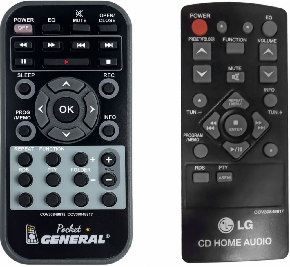 Dálkový ovladač LG COV30849817 duplikát 1:1 originálního dálkového ovladače. Dálkový ovladač byl vyvinut speciálně na míru pro tyto modely značky LG:CM153, CM1530, CM1530BT, COV30849817. (Nemusí zde být uvedeny úplně všechny kompatibilní modely. Pokud si nejste jisti, sdělte nám svůj model (použijte online chat, e-mail, telefon), neprodleně zkontrolujeme a ověříme, zda je tento ovladač kompatibilní s Vaším přístrojem. Za poskytnutou informaci ručíme.) Dálkový ovladač General POCKET duplikát má naprosto všechny funkce a popisky tlačítek stejné jako originální dálkový ovladač. Není třeba nic nastavovat, žádné kódy, funguje ihned po vložení baterií se všemi výše uvedenými modely.Ovladač je dodáván ve verzi značkového dálkového ovladače General POCKET duplikát (zobrazen vlevo) Jedná se o ovladač vyrobený pro specifické zařízení – NENÍ to univerzální ovladač! Má naprosto všechny funkce jako originální dálkový ovladač. Má stejné popisky tlačítek, jako jste byli zvyklí z originálu. Popisky tlačítek jsou velmi odolné a nejdou seškrábat ani hrubou silou. 3 roky záruka.General POCKET duplikát byl navržen a vyroben přesně podle originálního dálkového ovladače tlačítko po tlačítku. Ovladač je vyvinut a testován v České republice a podléhá CE a ROHS standardům. SNADNÉ INTUITIVNÍ POUŽÍVÁNÍ: Na rozdíl od běžných náhradních ovladačů, General POCKET duplikát má 100% odpovídající popisky tlačítek jako na originálním ovladači. Srovnání: Jiné univerzální nebo programovatelné náhrady mají kvůli snížení nákladů názvy/popisky a rozložení tlačítek univerzální, popisky tlačítek často neodpovídají funkci tlačítka a vyžadují tedy návody k použití. To často vede k nejasnostem, co které tlačítko dělá a stálá potřeba manuálu je velmi obtěžující. S ovladačem General POCKET duplikát žádný návod nepotřebujete, tlačítko dělá přesně to, co symbolizuje jeho popisek.GARANTUJEME 100% FUNKČNOST: Narozdíl od jiných náhrad je každý dálkový ovladač General POCKET duplikát přímo v naší firmě navržen a testován na..