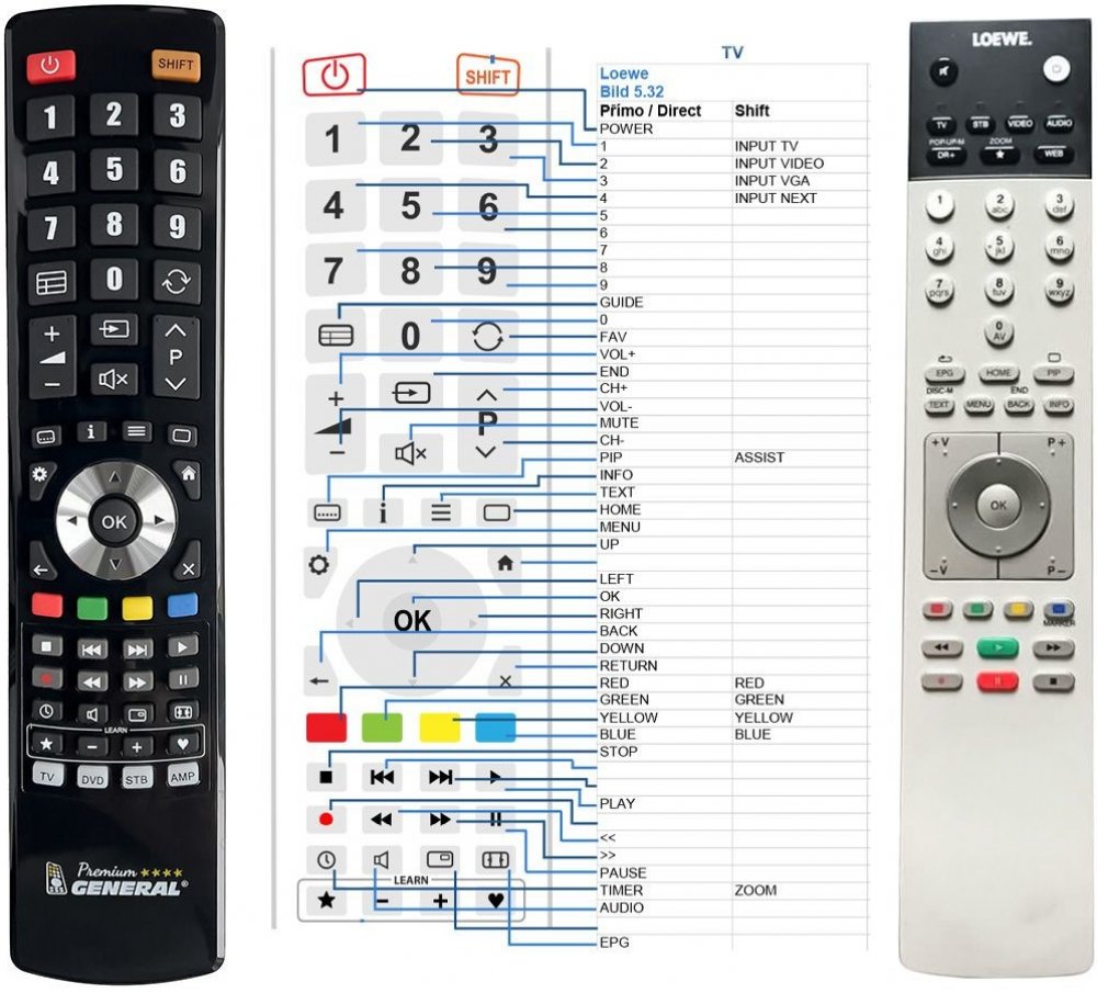 Náhradní dálkový ovladač LOEWE Bild 5.32, Bild 5.40, Bild 5.48, Bild 5.55 - 100% náhrada 1:1 za originální dálkový ovladač. Dálkový ovladač byl vyvinut speciálně na míru pro tyto modely značky LOEWE:BILD 1, BILD 2, BILD 3, BILD 4, BILD 5, BILD 5.32, BILD 5.40, BILD 5.48, BILD 5.55, BILD 7, BILD 9, CHASSIS SL 155, LOEWE INDIVIDUAL 40. (Nemusí zde být uvedeny úplně všechny kompatibilní modely. Pokud si nejste jisti, sdělte nám svůj model (použijte online chat, e-mail, telefon), neprodleně zkontrolujeme a ověříme, zda je tento ovladač kompatibilní s Vaším přístrojem. Za poskytnutou informaci ručíme.) Ovladač je dodáván ve verzi značkového dálkového ovladače General Premium (zobrazen vlevo). Garantujeme Vám, že dostanete ovladač, který plně nahradí Váš původní originální ovladač a bude mít naprosto všechny funkce stejné.Není to univerzální ovladač, ale ovladač, který je naprogramován a přímo určen pro modely přístrojů uvedené výše. Není třeba žádné párování, žádné kódy. Obdržíte od nás ovladač, který je připraven k použití - jediné, co musíte udělat, je vložit baterie a ovladač hned funguje. Podívejte se na obrázek ovladače a ujistěte se, že jsou v tabulce všechny funkce jako na původním originálním ovladači. Jedná se o plnohodnotný náhradní dálkový ovladač (není to „univerzál“). Má naprosto všechny funkce přesně jako originální ovladač. Záruční lhůta na ovladač je 3 roky. Dodáván také jednoduchý návod s mapováním funkcí. DOPLŇKOVÁ FUNKCE: Tento dálkový ovladač je možno naprogramovat na 1-4 zařízení (celkem tedy 4). Budete moci jedním ovladačem ovládat několik různých přístrojů jedním ovladačem. Pokud nám do komentáře v objednávce napíšete modely dalších přístrojů, naprogramujeme Vám ovladač na všechny. Za tuto doplňkovou službu bude naúčtován příplatek k ceně ovladače 50 Kč: více informacíV případě, že v budoucnu vyměníte/obměníte Vaši domácí elektroniku, jsme schopni Vám tento ovladač přeprogramovat na naprosto jakékoliv nové/á zařízení. Ovladač Gene..