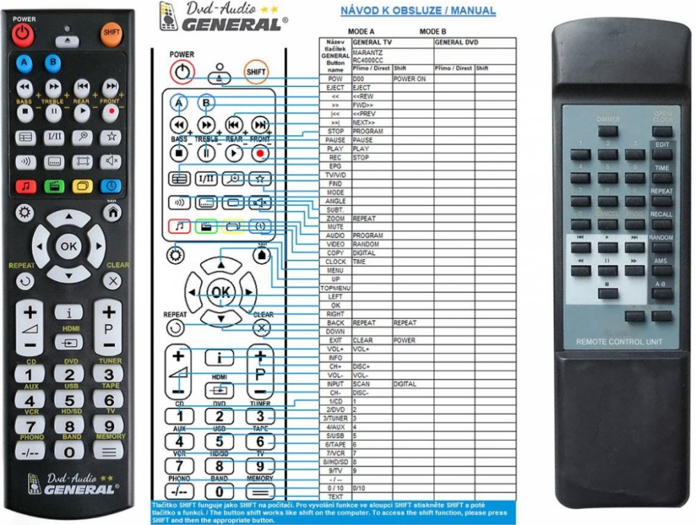 Náhradní dálkový ovladač MARANTZ RC-67CD (RC67CD) - 100% náhrada 1:1 za originální dálkový ovladač. Dálkový ovladač byl vyvinut speciálně na míru pro tyto modely značky MARANTZ:CD 1010, CD1010, CD1020, CD11LE, CD40, CD5001, CD5003, CD5004, CD52MKII, CD5400, CD67, CD67SE, RC67CD. (Nemusí zde být uvedeny úplně všechny kompatibilní modely. Pokud si nejste jisti, sdělte nám svůj model (použijte online chat, e-mail, telefon), neprodleně zkontrolujeme a ověříme, zda je tento ovladač kompatibilní s Vaším přístrojem. Za poskytnutou informaci ručíme.) Ovladač je dodáván ve verzi značkového dálkového ovladače General DVD/AUDIO (zobrazen vlevo). Garantujeme Vám, že dostanete ovladač, který plně nahradí Váš původní originální ovladač a bude mít naprosto všechny funkce stejné.Není to univerzální ovladač, ale ovladač, který je naprogramován a přímo určen pro modely přístrojů uvedené výše. Není třeba žádné párování, žádné kódy. Obdržíte od nás ovladač, který je připraven k použití - jediné, co musíte udělat, je vložit baterie a ovladač hned funguje. Podívejte se na obrázek ovladače a ujistěte se, že jsou v tabulce všechny funkce jako na původním originálním ovladači. Jedná se o plnohodnotný náhradní dálkový ovladač (není to „univerzál“). Má naprosto všechny funkce přesně jako originální ovladač. Záruční lhůta na ovladač je 3 roky. Dodáván také jednoduchý návod s mapováním funkcí. DOPLŇKOVÁ FUNKCE: Tento dálkový ovladač je možno naprogramovat na 1 další přístroj. Budete moci jedním ovladačem ovládat oba přístroje (např. DVD+TV nebo SOUNDBAR+TV apod.). Pokud nám do komentáře v objednávce napíšete model dalšího přístroje, naprogramujeme Vám ovladač na oba. Za tuto doplňkovou službu bude naúčtován příplatek k ceně ovladače 50 Kč: více informací