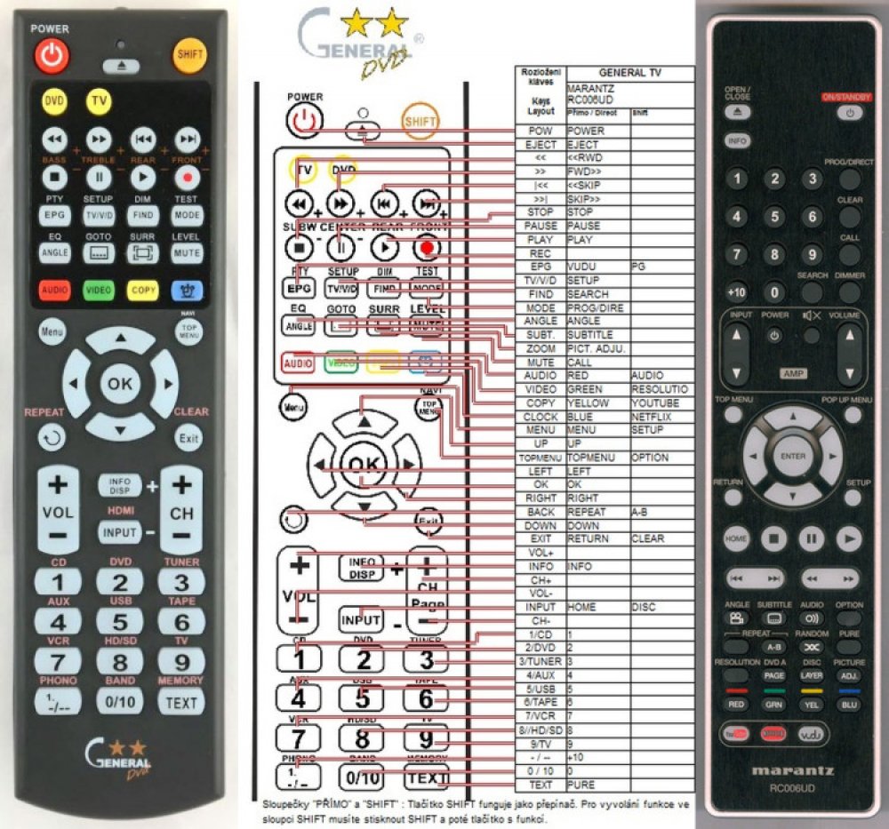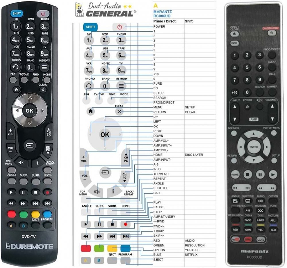 Dálkový ovladač MARANTZ RC-006UD (RC006UD) duplikát 1:1 originálního dálkového ovladače. Dálkový ovladač byl vyvinut speciálně na míru pro tyto modely značky MARANTZ:UD5007, UD7007. (Nemusí zde být uvedeny úplně všechny kompatibilní modely. Pokud si nejste jisti, sdělte nám svůj model (použijte online chat, e-mail, telefon), neprodleně zkontrolujeme a ověříme, zda je tento ovladač kompatibilní s Vaším přístrojem. Za poskytnutou informaci ručíme.) Dálkový ovladač General Duremote má naprosto všechny funkce a popisky tlačítek stejné jako originální dálkový ovladač. Není třeba nic nastavovat, žádné kódy, funguje ihned po vložení baterií se všemi výše uvedenými modely.Ovladač je dodáván ve verzi značkového dálkového ovladače General Duremote (zobrazen vlevo) Jedná se o ovladač vyrobený pro specifické zařízení – NENÍ to univerzální ovladač! Má naprosto všechny funkce jako originální dálkový ovladač. Má stejné popisky tlačítek, jako jste byli zvyklí z originálu. Popisky tlačítek jsou velmi odolné a nejdou seškrábat ani hrubou silou. 3 roky záruka.General Duremote byl navržen a vyroben přesně podle originálního dálkového ovladače tlačítko po tlačítku. Ovladač je vyvinut a testován v České republice a podléhá CE a ROHS standardům. SNADNÉ INTUITIVNÍ POUŽÍVÁNÍ: Na rozdíl od běžných náhradních ovladačů, General Duremote má 100% odpovídající popisky tlačítek jako na originálním ovladači. Srovnání: Jiné univerzální nebo programovatelné náhrady mají kvůli snížení nákladů názvy/popisky a rozložení tlačítek univerzální, popisky tlačítek často neodpovídají funkci tlačítka a vyžadují tedy návody k použití. To často vede k nejasnostem, co které tlačítko dělá a stálá potřeba manuálu je velmi obtěžující. S ovladačem General Duremote žádný návod nepotřebujete, tlačítko dělá přesně to, co symbolizuje jeho popisek.GARANTUJEME 100% FUNKČNOST: Narozdíl od jiných náhrad je každý dálkový ovladač General Duremote přímo v naší firmě navržen a testován na míru pro konkrétní zařízení tak, aby každé tla..