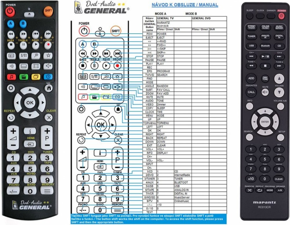 Náhradní dálkový ovladač MARANTZ RC013CR - 100% náhrada 1:1 za originální dálkový ovladač. Dálkový ovladač byl vyvinut speciálně na míru pro tyto modely značky MARANTZ:M-CR611, MCR611. (Nemusí zde být uvedeny úplně všechny kompatibilní modely. Pokud si nejste jisti, sdělte nám svůj model (použijte online chat, e-mail, telefon), neprodleně zkontrolujeme a ověříme, zda je tento ovladač kompatibilní s Vaším přístrojem. Za poskytnutou informaci ručíme.) Ovladač je dodáván ve verzi značkového dálkového ovladače General DVD/AUDIO (zobrazen vlevo). Garantujeme Vám, že dostanete ovladač, který plně nahradí Váš původní originální ovladač a bude mít naprosto všechny funkce stejné.Není to univerzální ovladač, ale ovladač, který je naprogramován a přímo určen pro modely přístrojů uvedené výše. Není třeba žádné párování, žádné kódy. Obdržíte od nás ovladač, který je připraven k použití - jediné, co musíte udělat, je vložit baterie a ovladač hned funguje. Podívejte se na obrázek ovladače a ujistěte se, že jsou v tabulce všechny funkce jako na původním originálním ovladači. Jedná se o plnohodnotný náhradní dálkový ovladač (není to „univerzál“). Má naprosto všechny funkce přesně jako originální ovladač. Záruční lhůta na ovladač je 3 roky. Dodáván také jednoduchý návod s mapováním funkcí. DOPLŇKOVÁ FUNKCE: Tento dálkový ovladač je možno naprogramovat na 1 další přístroj. Budete moci jedním ovladačem ovládat oba přístroje (např. DVD+TV nebo SOUNDBAR+TV apod.). Pokud nám do komentáře v objednávce napíšete model dalšího přístroje, naprogramujeme Vám ovladač na oba. Za tuto doplňkovou službu bude naúčtován příplatek k ceně ovladače 50 Kč: více informací