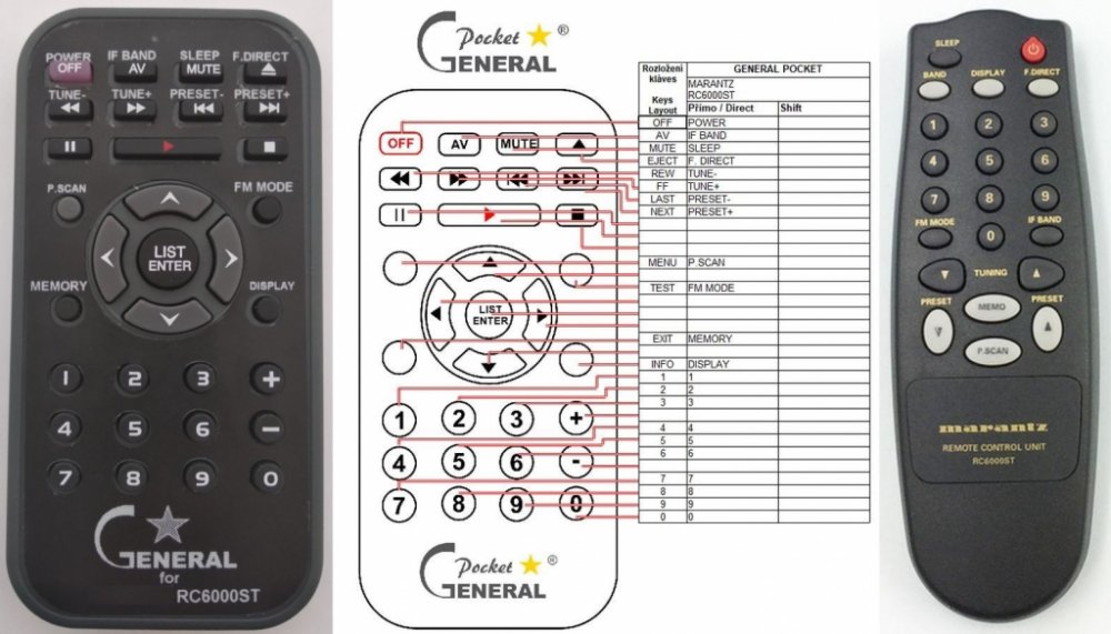 Dálkový ovladač MARANTZ RC6000ST duplikát 1:1 originálního dálkového ovladače. Dálkový ovladač byl vyvinut speciálně na míru pro tyto modely značky MARANTZ:ST-6000, ST6000. (Nemusí zde být uvedeny úplně všechny kompatibilní modely. Pokud si nejste jisti, sdělte nám svůj model (použijte online chat, e-mail, telefon), neprodleně zkontrolujeme a ověříme, zda je tento ovladač kompatibilní s Vaším přístrojem. Za poskytnutou informaci ručíme.) Dálkový ovladač General POCKET duplikát má naprosto všechny funkce a popisky tlačítek stejné jako originální dálkový ovladač. Není třeba nic nastavovat, žádné kódy, funguje ihned po vložení baterií se všemi výše uvedenými modely.Ovladač je dodáván ve verzi značkového dálkového ovladače General POCKET duplikát (zobrazen vlevo) Jedná se o ovladač vyrobený pro specifické zařízení – NENÍ to univerzální ovladač! Má naprosto všechny funkce jako originální dálkový ovladač. Má stejné popisky tlačítek, jako jste byli zvyklí z originálu. Popisky tlačítek jsou velmi odolné a nejdou seškrábat ani hrubou silou. 3 roky záruka.General POCKET duplikát byl navržen a vyroben přesně podle originálního dálkového ovladače tlačítko po tlačítku. Ovladač je vyvinut a testován v České republice a podléhá CE a ROHS standardům. SNADNÉ INTUITIVNÍ POUŽÍVÁNÍ: Na rozdíl od běžných náhradních ovladačů, General POCKET duplikát má 100% odpovídající popisky tlačítek jako na originálním ovladači. Srovnání: Jiné univerzální nebo programovatelné náhrady mají kvůli snížení nákladů názvy/popisky a rozložení tlačítek univerzální, popisky tlačítek často neodpovídají funkci tlačítka a vyžadují tedy návody k použití. To často vede k nejasnostem, co které tlačítko dělá a stálá potřeba manuálu je velmi obtěžující. S ovladačem General POCKET duplikát žádný návod nepotřebujete, tlačítko dělá přesně to, co symbolizuje jeho popisek.GARANTUJEME 100% FUNKČNOST: Narozdíl od jiných náhrad je každý dálkový ovladač General POCKET duplikát přímo v naší firmě navržen a testován na míru pro konk..