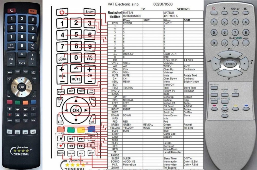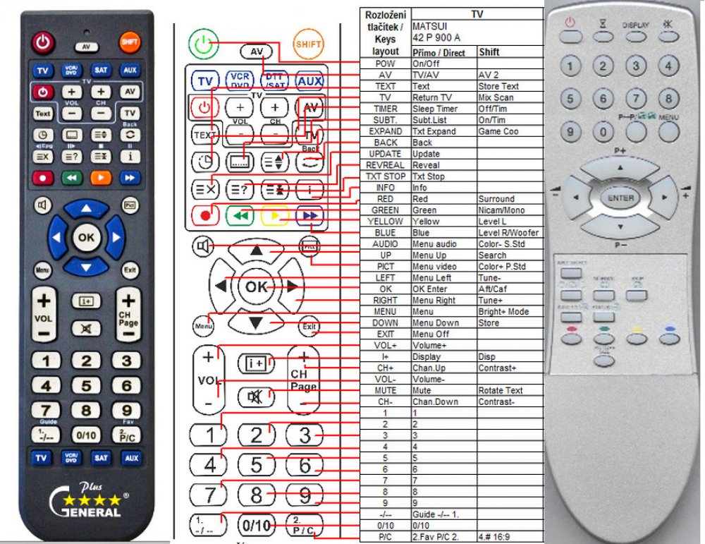 Náhradní dálkový ovladač MATSUI 42P900 - 100% náhrada 1:1 za originální dálkový ovladač. Dálkový ovladač byl vyvinut speciálně na míru pro tyto modely značky MATSUI:076R0DG110, 076R0DG220, 076R0DN090, 1420T, 2107, 2109R, 28WIN04, 28WIN05, 42P900. (Nemusí zde být uvedeny úplně všechny kompatibilní modely. Pokud si nejste jisti, sdělte nám svůj model (použijte online chat, e-mail, telefon), neprodleně zkontrolujeme a ověříme, zda je tento ovladač kompatibilní s Vaším přístrojem. Za poskytnutou informaci ručíme.) Ovladač je dodáván ve verzi značkového dálkového ovladače General Premium (zobrazen vlevo). Garantujeme Vám, že dostanete ovladač, který plně nahradí Váš původní originální ovladač a bude mít naprosto všechny funkce stejné.Není to univerzální ovladač, ale ovladač, který je naprogramován a přímo určen pro modely přístrojů uvedené výše. Není třeba žádné párování, žádné kódy. Obdržíte od nás ovladač, který je připraven k použití - jediné, co musíte udělat, je vložit baterie a ovladač hned funguje. Podívejte se na obrázek ovladače a ujistěte se, že jsou v tabulce všechny funkce jako na původním originálním ovladači. Jedná se o plnohodnotný náhradní dálkový ovladač (není to „univerzál“). Má naprosto všechny funkce přesně jako originální ovladač. Záruční lhůta na ovladač je 3 roky. Dodáván také jednoduchý návod s mapováním funkcí. DOPLŇKOVÁ FUNKCE: Tento dálkový ovladač je možno naprogramovat na 1-4 zařízení (celkem tedy 4). Budete moci jedním ovladačem ovládat několik různých přístrojů jedním ovladačem. Pokud nám do komentáře v objednávce napíšete modely dalších přístrojů, naprogramujeme Vám ovladač na všechny. Za tuto doplňkovou službu bude naúčtován příplatek k ceně ovladače 50 Kč: více informacíV případě, že v budoucnu vyměníte/obměníte Vaši domácí elektroniku, jsme schopni Vám tento ovladač přeprogramovat na naprosto jakékoliv nové/á zařízení. Ovladač General přežije Váš stávající přístroj!