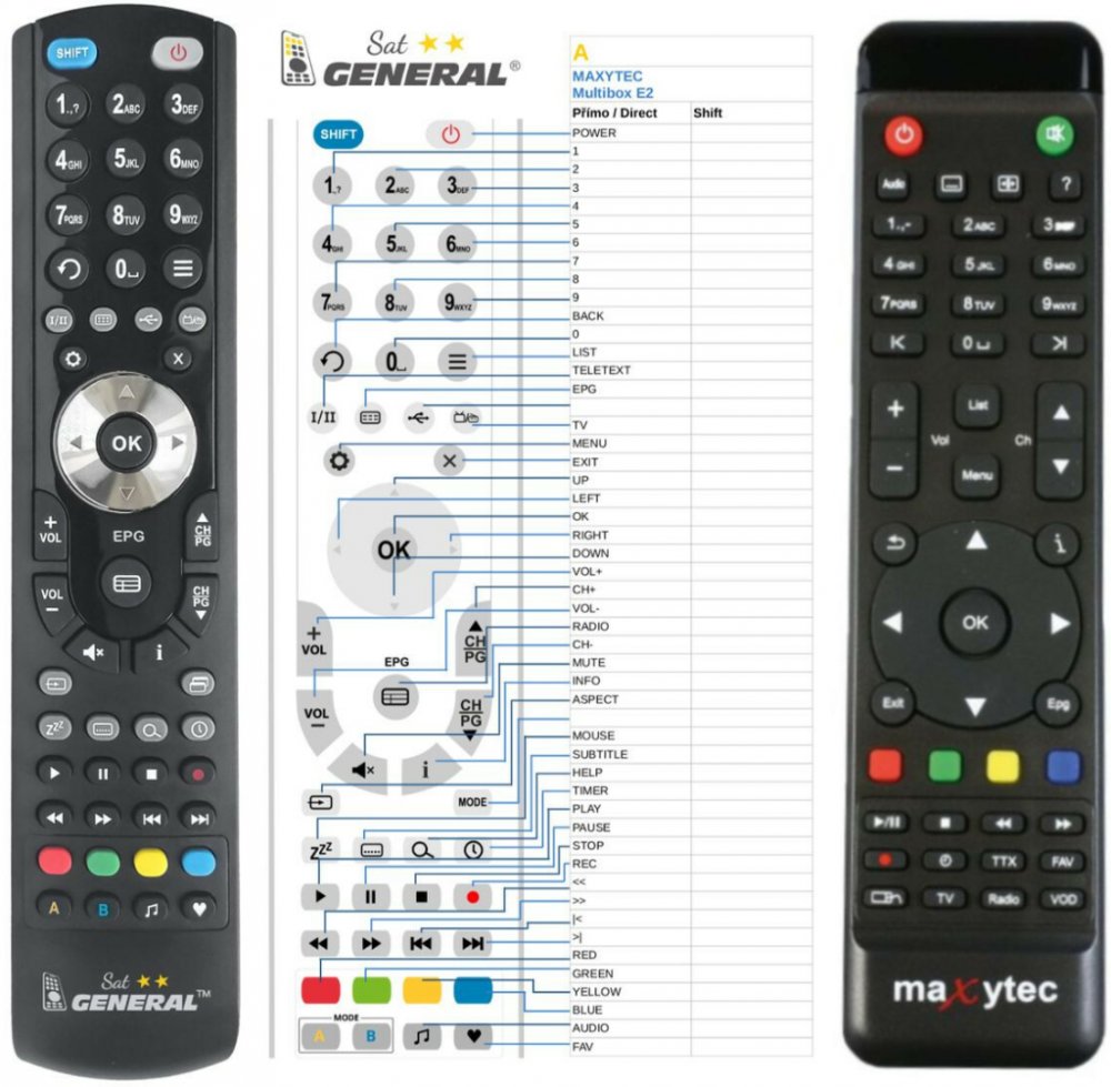 Náhradní dálkový ovladač MAXYTEC Multibox E2 - 100% náhrada 1:1 za originální dálkový ovladač. Dálkový ovladač je plně kompatibilní s následujícími modely :AX HD60 , MUTANT HD60 . (Nemusí zde být uvedeny všechny podporované modely. Pokud si nejste jisti zda bude fungovat napište nám svůj model) Ovladač je dodáván ve verzi značkového dálkového ovladače General SAT/TV (zobrazen vlevo). Garantujeme V