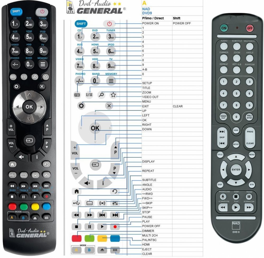Náhradní dálkový ovladač NAD DVD9 - 100% náhrada 1:1 za originální dálkový ovladač. Dálkový ovladač byl vyvinut speciálně na míru pro tyto modely značky NAD:T-535, T535. (Nemusí zde být uvedeny úplně všechny kompatibilní modely. Pokud si nejste jisti, sdělte nám svůj model (použijte online chat, e-mail, telefon), neprodleně zkontrolujeme a ověříme, zda je tento ovladač kompatibilní s Vaším přístrojem. Za poskytnutou informaci ručíme.) Ovladač je dodáván ve verzi značkového dálkového ovladače General DVD/AUDIO (zobrazen vlevo). Garantujeme Vám, že dostanete ovladač, který plně nahradí Váš původní originální ovladač a bude mít naprosto všechny funkce stejné.Není to univerzální ovladač, ale ovladač, který je naprogramován a přímo určen pro modely přístrojů uvedené výše. Není třeba žádné párování, žádné kódy. Obdržíte od nás ovladač, který je připraven k použití - jediné, co musíte udělat, je vložit baterie a ovladač hned funguje. Podívejte se na obrázek ovladače a ujistěte se, že jsou v tabulce všechny funkce jako na původním originálním ovladači. Jedná se o plnohodnotný náhradní dálkový ovladač (není to „univerzál“). Má naprosto všechny funkce přesně jako originální ovladač. Záruční lhůta na ovladač je 3 roky. Dodáván také jednoduchý návod s mapováním funkcí. DOPLŇKOVÁ FUNKCE: Tento dálkový ovladač je možno naprogramovat na 1 další přístroj. Budete moci jedním ovladačem ovládat oba přístroje (např. DVD+TV nebo SOUNDBAR+TV apod.). Pokud nám do komentáře v objednávce napíšete model dalšího přístroje, naprogramujeme Vám ovladač na oba. Za tuto doplňkovou službu bude naúčtován příplatek k ceně ovladače 50 Kč: více informací