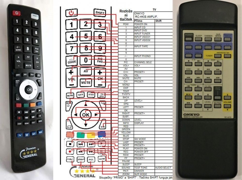 Náhradní dálkový ovladač ONKYO RC-427S (RC427S) - 100% náhrada 1:1 za originální dálkový ovladač. Dálkový ovladač byl vyvinut speciálně na míru pro tyto modely značky ONKYO:TX-DS484, TXDS484. (Nemusí zde být uvedeny úplně všechny kompatibilní modely. Pokud si nejste jisti, sdělte nám svůj model (použijte online chat, e-mail, telefon), neprodleně zkontrolujeme a ověříme, zda je tento ovladač kompatibilní s Vaším přístrojem. Za poskytnutou informaci ručíme.) Ovladač je dodáván ve verzi značkového dálkového ovladače General Premium (zobrazen vlevo). Garantujeme Vám, že dostanete ovladač, který plně nahradí Váš původní originální ovladač a bude mít naprosto všechny funkce stejné.Není to univerzální ovladač, ale ovladač, který je naprogramován a přímo určen pro modely přístrojů uvedené výše. Není třeba žádné párování, žádné kódy. Obdržíte od nás ovladač, který je připraven k použití - jediné, co musíte udělat, je vložit baterie a ovladač hned funguje. Podívejte se na obrázek ovladače a ujistěte se, že jsou v tabulce všechny funkce jako na původním originálním ovladači. Jedná se o plnohodnotný náhradní dálkový ovladač (není to „univerzál“). Má naprosto všechny funkce přesně jako originální ovladač. Záruční lhůta na ovladač je 3 roky. Dodáván také jednoduchý návod s mapováním funkcí. DOPLŇKOVÁ FUNKCE: Tento dálkový ovladač je možno naprogramovat na 1-4 zařízení (celkem tedy 4). Budete moci jedním ovladačem ovládat několik různých přístrojů jedním ovladačem. Pokud nám do komentáře v objednávce napíšete modely dalších přístrojů, naprogramujeme Vám ovladač na všechny. Za tuto doplňkovou službu bude naúčtován příplatek k ceně ovladače 50 Kč: více informacíV případě, že v budoucnu vyměníte/obměníte Vaši domácí elektroniku, jsme schopni Vám tento ovladač přeprogramovat na naprosto jakékoliv nové/á zařízení. Ovladač General přežije Váš stávající přístroj!