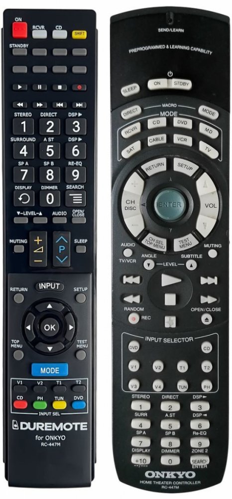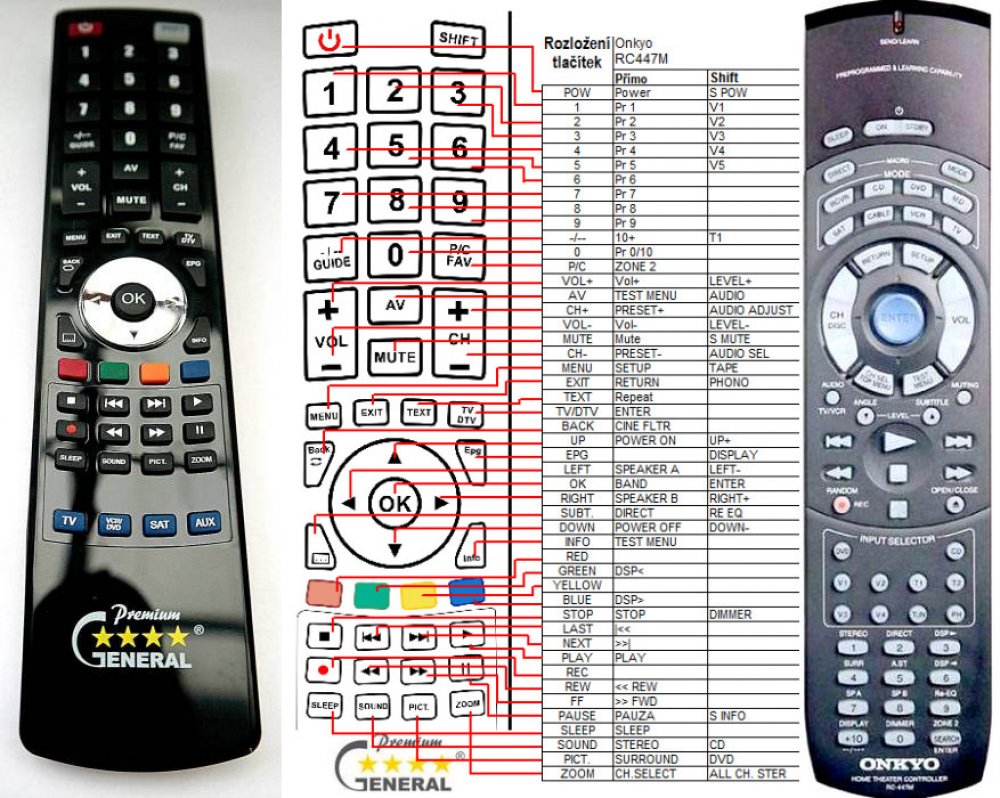Dálkový ovladač ONKYO RC-447M (RC447M) duplikát 1:1 originálního dálkového ovladače. Dálkový ovladač je určen pro tyto modely ONKYO: TXDS595, TXDS959. (Nemusí zde být uvedeny úplně všechny kompatibilní modely. Pokud si nejste jisti, sdělte nám svůj model (použijte online chat, e-mail, telefon), neprodleně zkontrolujeme a ověříme, zda je tento ovladač kompatibilní s Vaším přístrojem. Za poskytnutou informaci ručíme.) Dálkový ovladač General Duremote má naprosto všechny funkce a popisky tlačítek stejné jako originální dálkový ovladač. Není třeba nic nastavovat, žádné kódy, funguje ihned po vložení baterií se všemi výše uvedenými modely. Ovladač je dodáván ve verzi značkového dálkového ovladače General Duremote (zobrazen vlevo) Jedná se o ovladač vyrobený pro specifické zařízení – NENÍ to univerzální ovladač! Má naprosto všechny funkce jako originální dálkový ovladač. Má stejné popisky tlačítek, jako jste byli zvyklí z originálu. Popisky tlačítek jsou velmi odolné a nejdou seškrábat ani hrubou silou. 2 roky záruka. General Duremote byl navržen a vyroben přesně podle originálního dálkového ovladače tlačítko po tlačítku. Ovladač je vyvinut a testován v České republice a podléhá CE a ROHS standardům. SNADNÉ INTUITIVNÍ POUŽÍVÁNÍ: Na rozdíl od běžných náhradních ovladačů, General Duremote má 100procent odpovídající popisky tlačítek jako na originálním ovladači. Srovnání: Jiné univerzální nebo programovatelné náhrady mají kvůli snížení nákladů názvy/popisky a rozložení tlačítek univerzální, popisky tlačítek často neodpovídají funkci tlačítka a vyžadují tedy návody k použití. To často vede k nejasnostem, co které tlačítko dělá a stálá potřeba manuálu je velmi obtěžující. S ovladačem General Duremote žádný návod nepotřebujete, tlačítko dělá přesně to, co symbolizuje jeho popisek. GARANTUJEME 100procent FUNKČNOST: Narozdíl od jiných náhrad je každý dálkový ovladač General Duremote přímo v naší firmě navržen a testován na míru pro konkrétní zařízení tak, aby každé tlačítko odpovídalo funkci tlačítka originálního ovladače. Díky tomu můžeme zaručit 100procent funkčnost přesně jako originální ovladač. Samotné šasi bylo navrženo a vyvíjeno tak, aby bylo co nejodolnější a nejspolehlivější. Zároveň však byl kladen důraz na přívětivé rozložení tlačítek a popisky tlačítek jsou optimalizovány pro dobrou viditelnost. Materiály a součástky byly podrobeny důkladným testům, aby odolaly i tomu nejtvrdšímu zacházení a poskytovaly tak dlouhodobou životnost. Názvy tlačítek jsou na ovladači natištěny moderní technologií v naší firmě (naše vlastní know-how). Tisk je extrémně odolný a nelze jej setřít ani oškrábat. DUPLIKÁT originálního dálkového ovladače má naprosto stejné funkce a stejné názvy tlačítek jako Váš původní originální ovladač. Nemusíte nic nastavovat, po vložení baterií bude okamžitě fungovat, ovladač je již nakonfigurován tak, aby fungoval na modely uvedené výše. Nápisy na tlačítkách přesně odpovídají funkcím tlačítek, tiskneme je přesně podle originálního ovladače. Narozdíl od všech univerzálních a programovatelných náhrad, kde jsou názvy tlačítek univerzální a pro uživatele matoucí. Popisky jsou natištěny technicky vyspělou technologií v naší provozovně (naše know-how), jsou extrémně odolné, nejdou setřít ani seškrábat (např. nehtem). Opravdu jsme schopni vyrobit jakýkoliv dálkový ovladač! Splníme i požadavky na exotické ovladače, které nejsou (zatím) v naší nabídce. DUPLIKÁT = Nejlepší poměr cena/výkon. DOPORUČUJEME! DUPLIKÁT originálního dálkového ovladače má naprosto stejné funkce a stejné názvy tlačítek jako Váš původní originální ovladač. Nemusíte nic nastavovat, po vložení baterií bude okamžitě fungovat, ovladač je již nakonfigurován tak, aby fungoval na modely uvedené níže. Nápisy na tlacitkach přesně odpovídají funkcím tlačítek, tiskneme je přesně podle oriignálního ovladače. Narozdil od všech univerzalnich a programovatelnych náhrad, kde jsou názvy tlačítek univerzální a pro uživatele matoucí. Popisky jsou natištěny technicky vyspělou technologií v naší provozovně (naše know-how), jsou extrémně odolné, nejdou setřít ani seškrábat (např.nehtem). Opravdu jsme schopni vyrobit jakýkoliv dálkový ovladač! Splníme i požadavky na exotické ovladače, které nejsou (zatím :) v naší nabídce. DUPLIKÁT = Nejlepší poměr cena/výkon. DOPORUČUJEME!