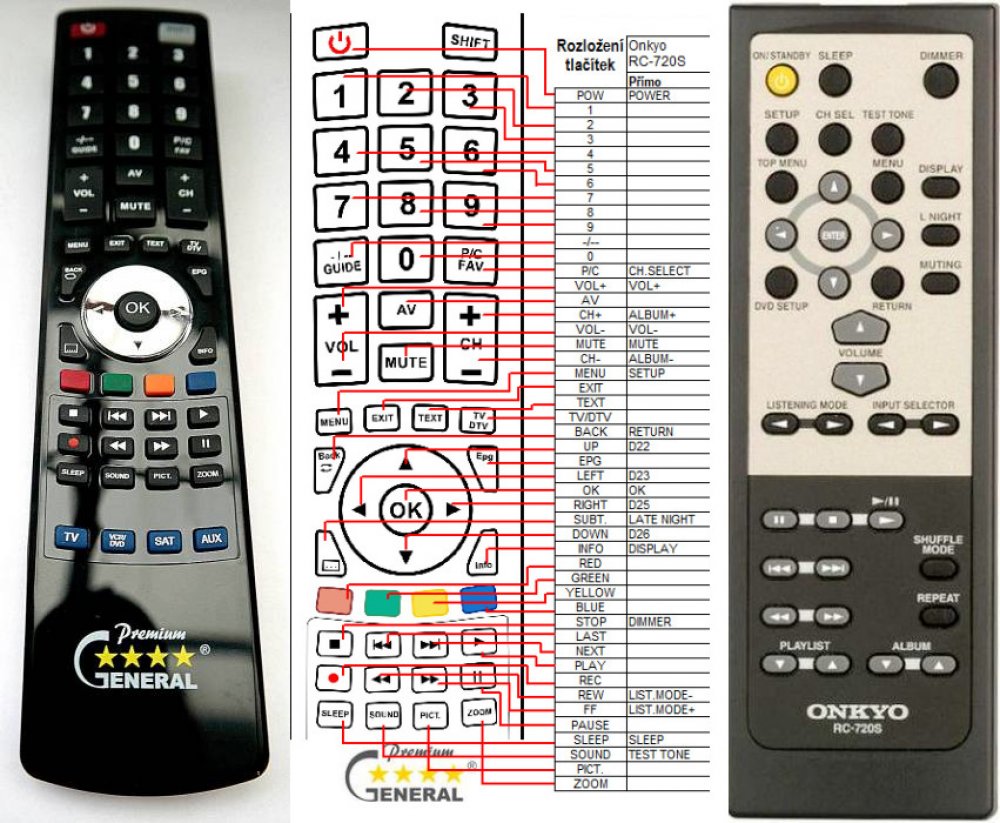 Náhradní dálkový ovladač ONKYO RC-720S (RC720S) - 100% náhrada 1:1 za originální dálkový ovladač. Dálkový ovladač byl vyvinut speciálně na míru pro tyto modely značky ONKYO:HTX-22HD, HTX-22HDX. (Nemusí zde být uvedeny úplně všechny kompatibilní modely. Pokud si nejste jisti, sdělte nám svůj model (použijte online chat, e-mail, telefon), neprodleně zkontrolujeme a ověříme, zda je tento ovladač kompatibilní s Vaším přístrojem. Za poskytnutou informaci ručíme.) Ovladač je dodáván ve verzi značkového dálkového ovladače General Premium (zobrazen vlevo). Garantujeme Vám, že dostanete ovladač, který plně nahradí Váš původní originální ovladač a bude mít naprosto všechny funkce stejné.Není to univerzální ovladač, ale ovladač, který je naprogramován a přímo určen pro modely přístrojů uvedené výše. Není třeba žádné párování, žádné kódy. Obdržíte od nás ovladač, který je připraven k použití - jediné, co musíte udělat, je vložit baterie a ovladač hned funguje. Podívejte se na obrázek ovladače a ujistěte se, že jsou v tabulce všechny funkce jako na původním originálním ovladači. Jedná se o plnohodnotný náhradní dálkový ovladač (není to „univerzál“). Má naprosto všechny funkce přesně jako originální ovladač. Záruční lhůta na ovladač je 3 roky. Dodáván také jednoduchý návod s mapováním funkcí. DOPLŇKOVÁ FUNKCE: Tento dálkový ovladač je možno naprogramovat na 1-4 zařízení (celkem tedy 4). Budete moci jedním ovladačem ovládat několik různých přístrojů jedním ovladačem. Pokud nám do komentáře v objednávce napíšete modely dalších přístrojů, naprogramujeme Vám ovladač na všechny. Za tuto doplňkovou službu bude naúčtován příplatek k ceně ovladače 50 Kč: více informacíV případě, že v budoucnu vyměníte/obměníte Vaši domácí elektroniku, jsme schopni Vám tento ovladač přeprogramovat na naprosto jakékoliv nové/á zařízení. Ovladač General přežije Váš stávající přístroj!