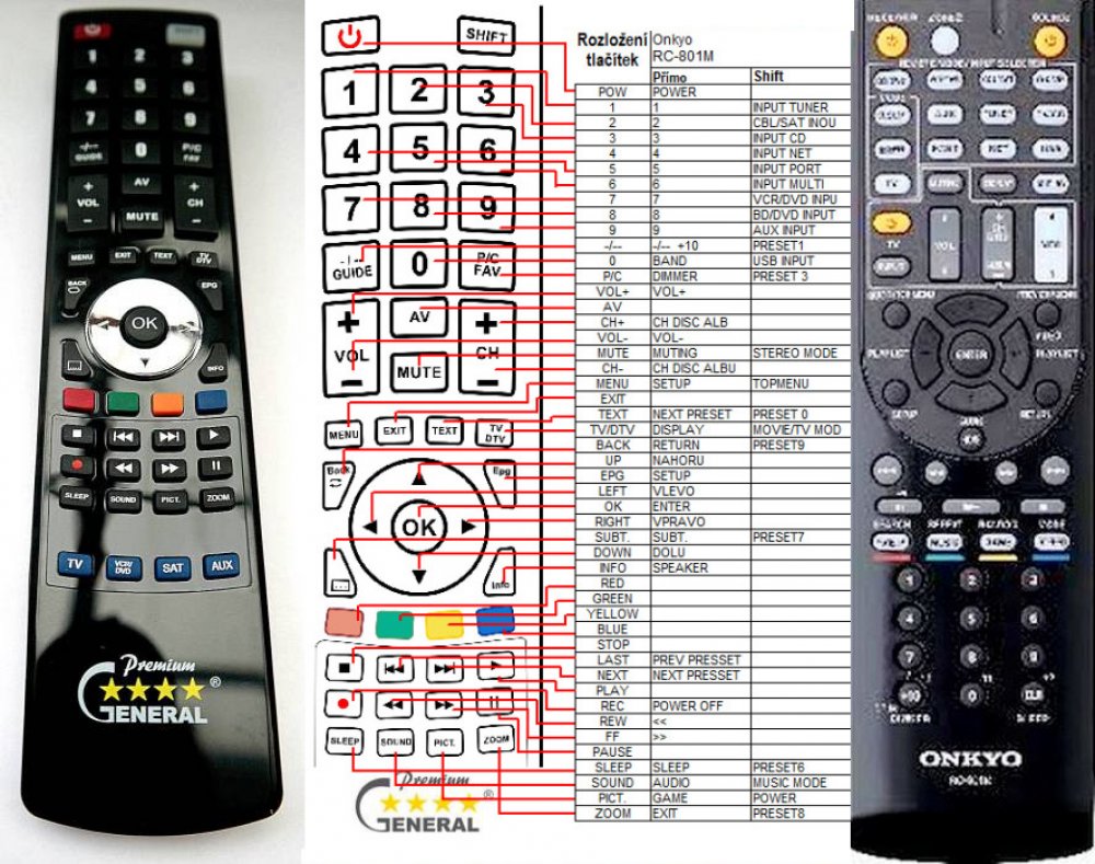 Náhradní dálkový ovladač ONKYO RC-801M (RC801M). Je určen pro tyto modely ONKYO: TXSR705, HTR990, TX-NR1010, TX-NR509, TX-NR609, TX-NR616, TX-NR709, TX-SR509, TX-SR705, TXNR509, TXNR579, TXNR609, TXNR616, TXNR709, TXSR509. (Nemusí zde být uvedeny úplně všechny kompatibilní modely. Pokud si nejste jisti, sdělte nám svůj model (použijte online chat, e-mail, telefon), neprodleně zkontrolujeme a ověříme, zda je tento ovladač kompatibilní s Vaším přístrojem. Za poskytnutou informaci ručíme.) Jedná se o naprosto stejný dálkový ovladač jako originál. Jediný rozdíl je, že nemá logo ONKYO (to je jediný důvod, proč je levnější). Vysoká kvalita materiálu a zpracování, naprosto bezporuchový. Všechny naše dálkové ovladače kontrolujeme a testujeme, proto garantujeme jejich spolehlivost, nadstandartně dlouhý dosah signálu a výbornou citlivost tlačítek.Tento dálkový ovladač nemusíte nijak párovat, nevyžaduje žádné nastavování ani kódy. Stačí vložit baterie a funguje se všemi výše uvedenými modely.