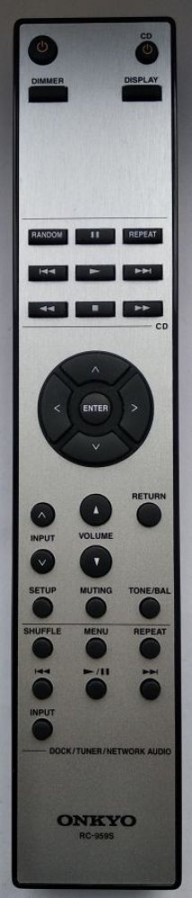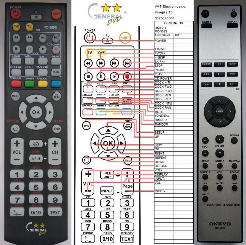 Náhradní dálkový ovladač ONKYO RC-959S (RC959S) - 100% náhrada 1:1 za originální dálkový ovladač. Dálkový ovladač je určen pro tyto modely ONKYO:A-9150, A9150. (Nemusí zde být uvedeny úplně všechny kompatibilní modely. Pokud si nejste jisti, sdělte nám svůj model (použijte online chat, e-mail, telefon), neprodleně zkontrolujeme a ověříme, zda je tento ovladač kompatibilní s Vaším přístrojem. Za poskytnutou informaci ručíme.) Ovladač je dodáván ve verzi značkového dálkového ovladače General DVD/AUDIO (zobrazen vlevo). Garantujeme Vám, že dostanete ovladač, který plně nahradí Váš původní originální ovladač a bude mít naprosto všechny funkce.Není to univerzální ovladač, ale ovladač, který je naprogramován a přímo určen pro modely přístrojů uvedené výše. Není třeba žádné párování, žádné kódy. Obdržíte od nás ovladač, který je připraven k použití - jediné, co musíte udělat, je vložit baterie a ovladač hned funguje. Podívejte se na obrázek ovladače a ujistěte se, že jsou v tabulce všechny funkce jako na původním originálním ovladači. Jedná se o plnohodnotný náhradní dálkový ovladač (není to „univerzál“). Má naprosto všechny funkce přesně jako originální ovladač. Záruční lhůta na ovladač je 2 roky. Dodáván také jednoduchý návod s mapováním funkcí. DOPLŇKOVÁ FUNKCE: Tento dálkový ovladač je možno naprogramovat na 1 další přístroj. Budete moci jedním ovladačem ovládat oba přístroje (např. DVD+TV nebo SOUNDBAR+TV apod.). Pokud nám do komentáře v objednávce napíšete model dalšího přístroje, naprogramujeme Vám ovladač na oba. Za tuto doplňkovou službu bude naúčtován příplatek k ceně ovladače 50 Kč: více informací