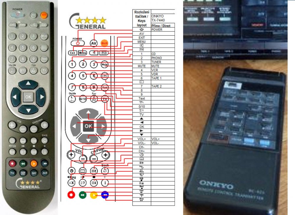 Náhradní dálkový ovladač ONKYO TX-7440 (TX7440) - 100% náhrada 1:1 za originální dálkový ovladač. Dálkový ovladač byl vyvinut speciálně na míru pro tyto modely značky ONKYO:TX-7440, TX7440. (Nemusí zde být uvedeny úplně všechny kompatibilní modely. Pokud si nejste jisti, sdělte nám svůj model (použijte online chat, e-mail, telefon), neprodleně zkontrolujeme a ověříme, zda je tento ovladač kompatibilní s Vaším přístrojem. Za poskytnutou informaci ručíme.) Ovladač je dodáván ve verzi značkového dálkového ovladače General 4 (zobrazen vlevo). Garantujeme Vám, že dostanete ovladač, který plně nahradí Váš původní originální ovladač a bude mít naprosto všechny funkce stejné.Není to univerzální ovladač, ale ovladač, který je naprogramován a přímo určen pro modely přístrojů uvedené výše. Není třeba žádné párování, žádné kódy. Obdržíte od nás ovladač, který je připraven k použití - jediné, co musíte udělat, je vložit baterie a ovladač hned funguje. Podívejte se na obrázek ovladače a ujistěte se, že jsou v tabulce všechny funkce jako na původním originálním ovladači. Jedná se o plnohodnotný náhradní dálkový ovladač (není to „univerzál“). Má naprosto všechny funkce přesně jako originální ovladač. Záruční lhůta na ovladač je 3 roky. Dodáván také jednoduchý návod s mapováním funkcí. DOPLŇKOVÁ FUNKCE: Tento dálkový ovladač je možno naprogramovat na 1-4 zařízení (celkem tedy 4). Budete moci jedním ovladačem ovládat několik různých přístrojů jedním ovladačem. Pokud nám do komentáře v objednávce napíšete modely dalších přístrojů, naprogramujeme Vám ovladač na všechny. Za tuto doplňkovou službu bude naúčtován příplatek k ceně ovladače 50 Kč: více informacíV případě, že v budoucnu vyměníte/obměníte Vaši domácí elektroniku, jsme schopni Vám tento ovladač přeprogramovat na naprosto jakékoliv nové/á zařízení. Ovladač General přežije Váš stávající přístroj!